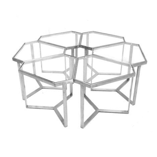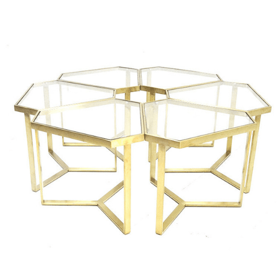Our geometric coffee table, with glass top and gold base, can be assembled any way you wish. Comprising of 6 separate pieces, can be spread about your living space or placed together to make one large coffee table.