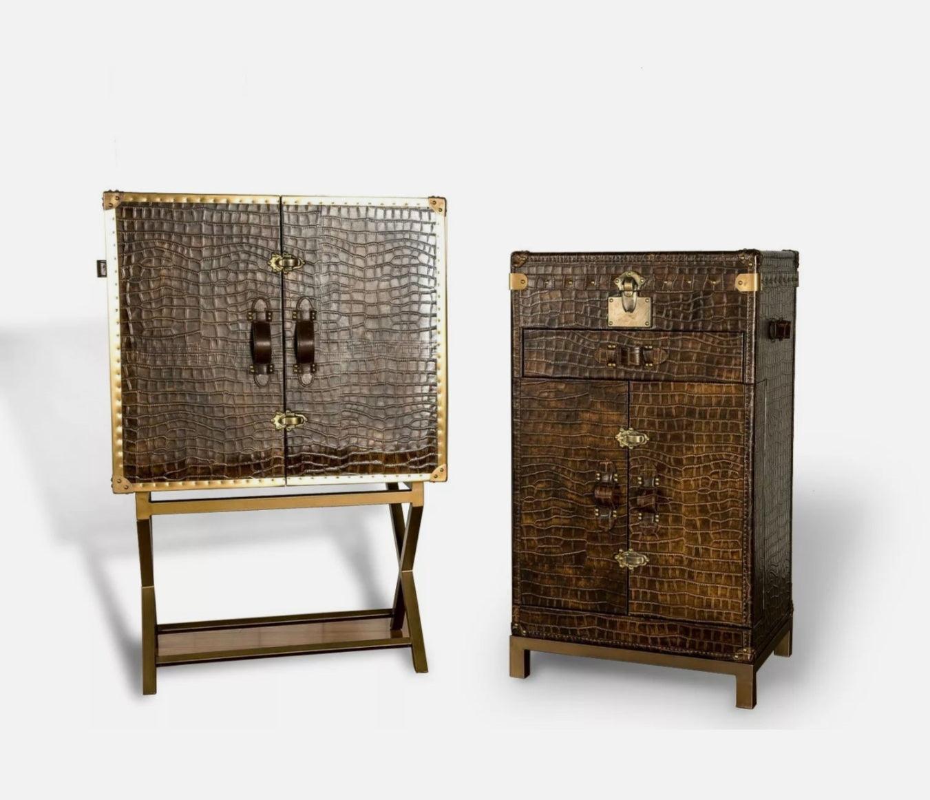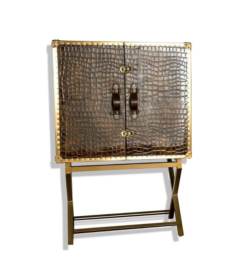 Martini Antique Brown Crocodile Leather Brass Bar Cabinet 120cm. Designer Crocodile Leather Liquor Cabinet Range. Full Grain Antique Leather with Crocodile Stamp.
