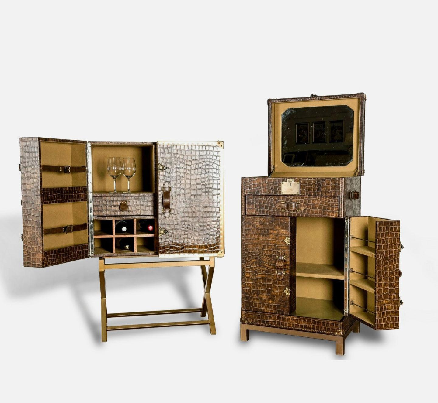 Wine Cabinet Range in Vintage Antique Crocodile Leather. Vintage, exquisite and luxurious. This wine cabinet range is a fantastic addition to your bar, lounge and personal man cave, providing you with plenty of storage for your wine, liquor and glasses while adding a luxurious enigmatic style to your home. Available in 2 different configurations, this wine cabinet is not only practical and fully functional, but it is also sure to be a wow factor when you have guests over for drinks. With its high-quality antique croc leather paired with its matte brass trim frames, this wine cabinet range is perfect for those who are looking to add classic sophistication and a touch of masculinity to their homes. Enjoy your drinks in luxury and style by adding our Antique Crocodile Leather Wine Cabinet to your home today!