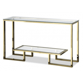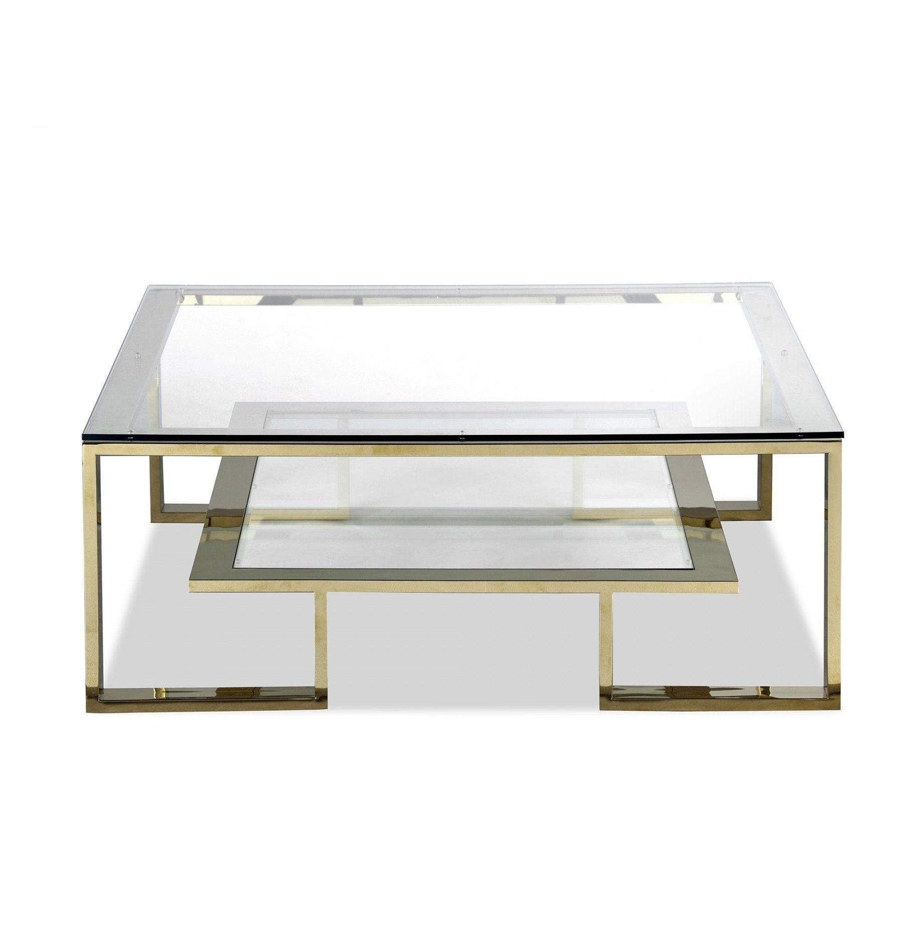 Mayfair square polished gold side table with clear glass top and shelf. Matching designs available in this collection.
