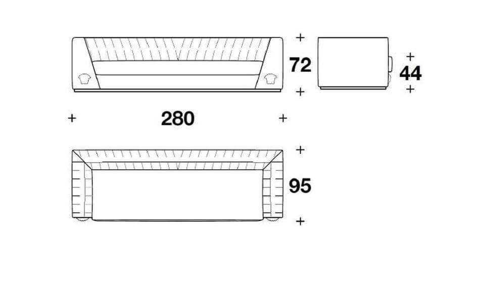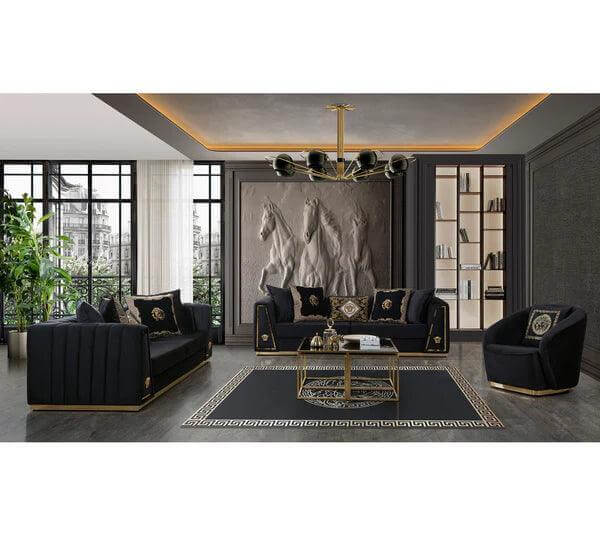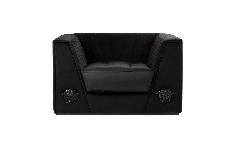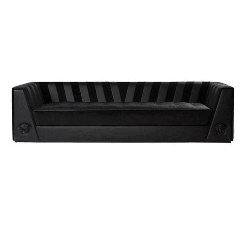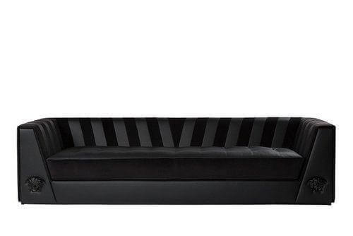 Medusa Black Italian Leather Sofa 280cm defined by the the sloping angle of its arms to the quilting of its back in leather. The sofa, which both contain Italian leather and black velvet detail, each highlighted by the Medusa head at the base.