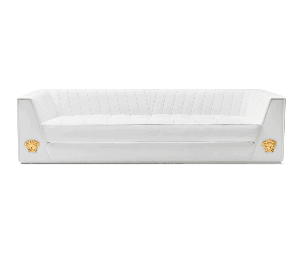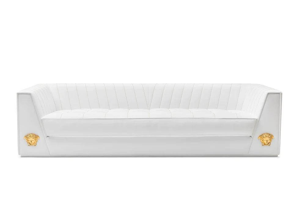 Medusa White Velvet Gold Sofa 280cm defined by the the sloping angle of its arms to the quilting of its back in leather. The arms, which both are each highlighted by the Medusa head at the base.