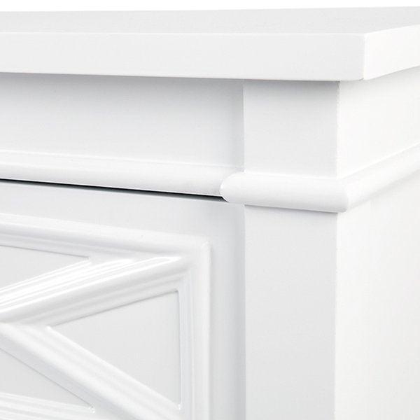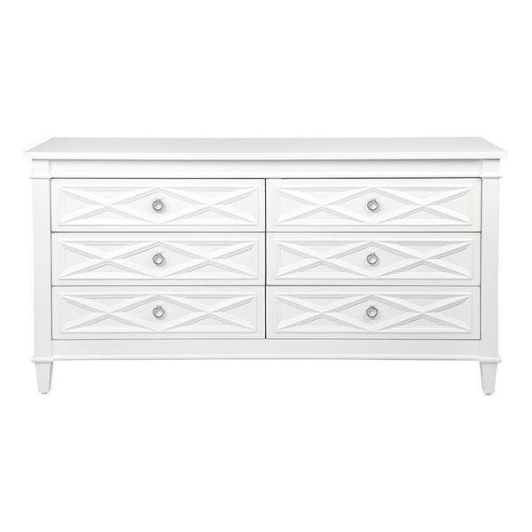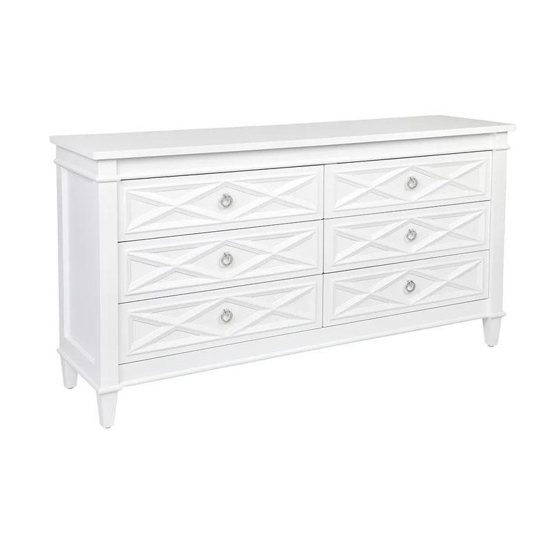 Mercer White Nickel Dressing Cabinet. White satin finished timber frame 6 drawer chest with a raised diamond pattern on the drawer fronts and polished nickel handles. Fully Assembled.