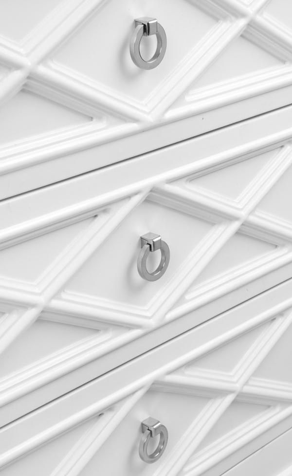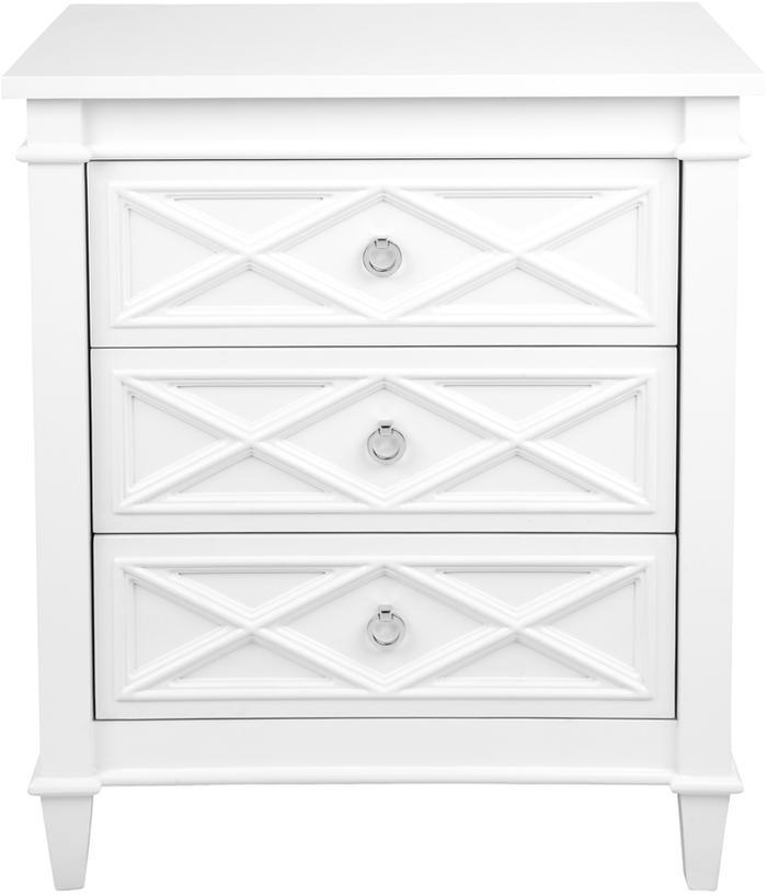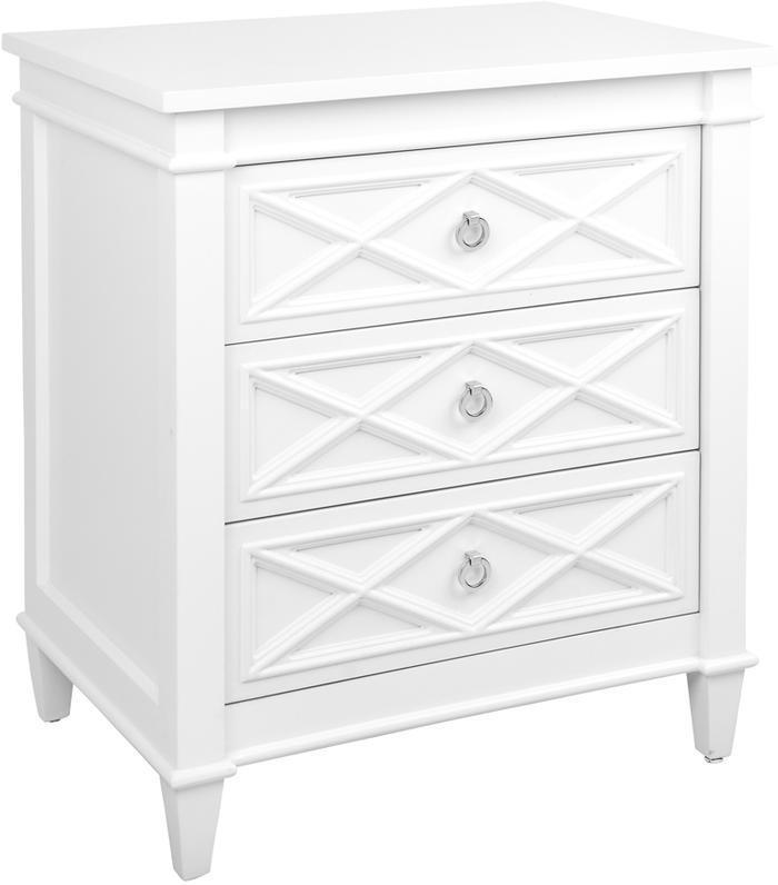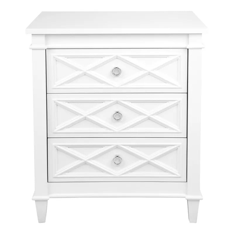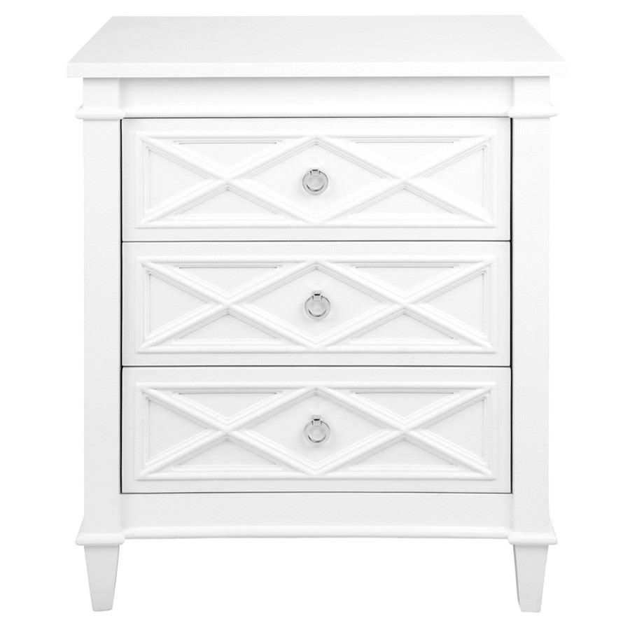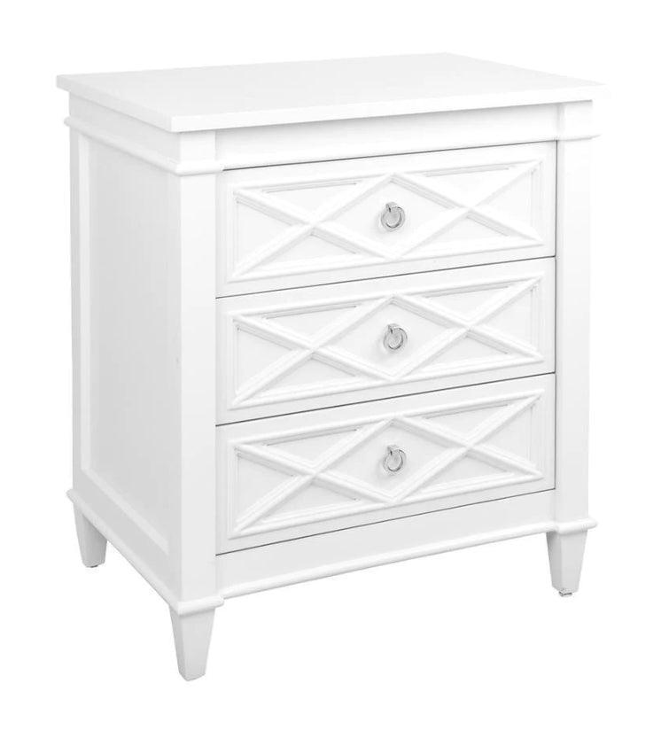 White Satin finished timber frame 3 drawer chest large bedside table with a raised diamond pattern on the drawer fronts and polished nickel handle.