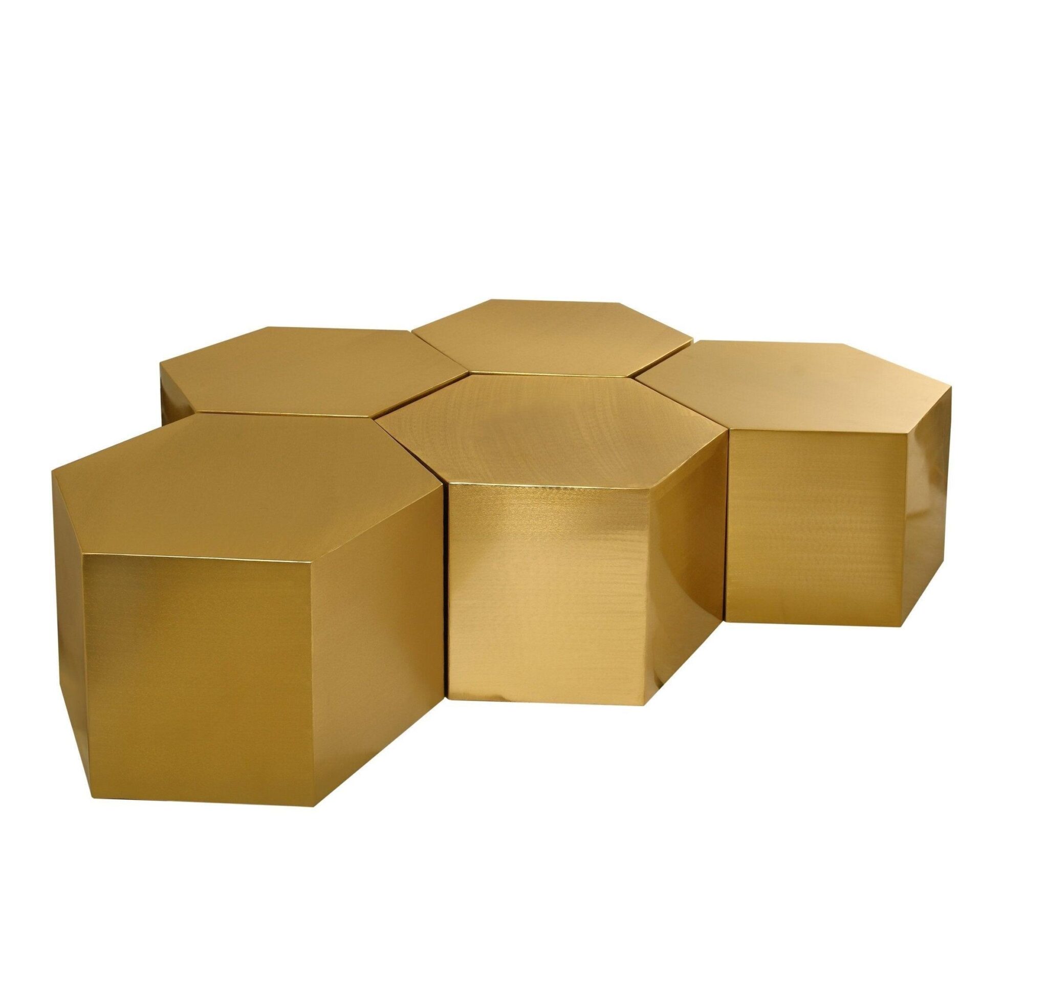 The Meridian Hexagon modular coffee table in brushed gold. Use one table on its own for a handy and stylish spot to hold your drinks or display a framed photo, or add multiple tables together to create even more space for entertaining or playing cards or board games. This metal table is completely customizable to your needs and features a bold hexagon shape for a modish feel.