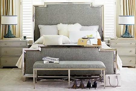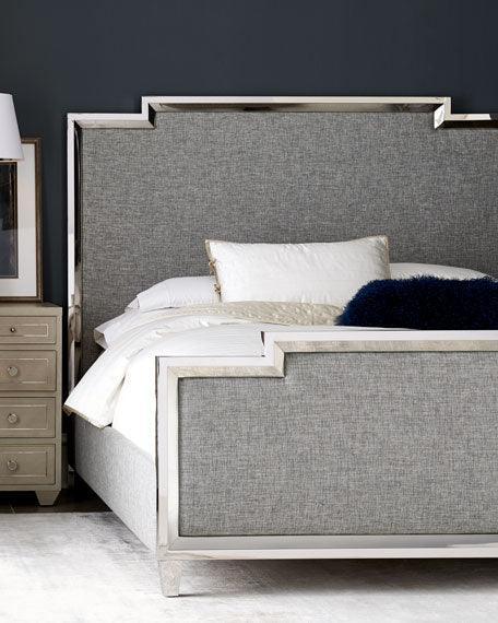 The Meridian Collection is a beautifully designed Manhattan inspired fabric upholstered bed. It features a polished chrome 304 stainless steel frame along the edges which creates an elegant structure, the luxurious linen fabric on the headboard is also padded for comfort. It is an elegant design that can elevate the look of any bedroom. Matching light grey upholstered chrome 120cm bench available.