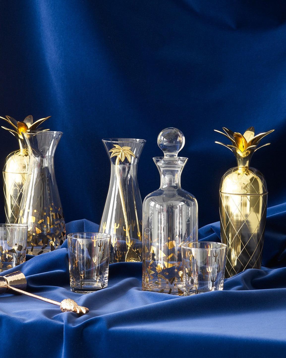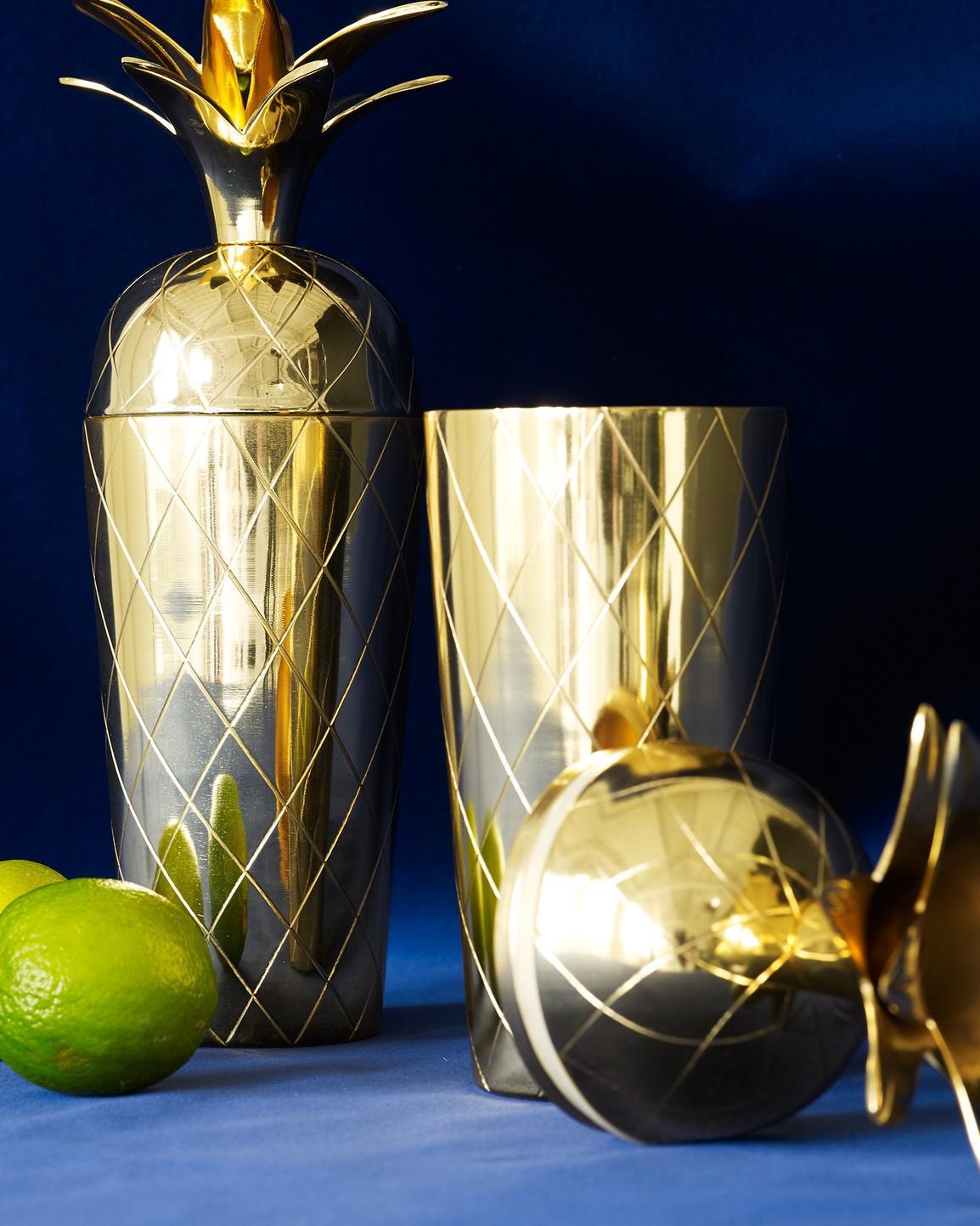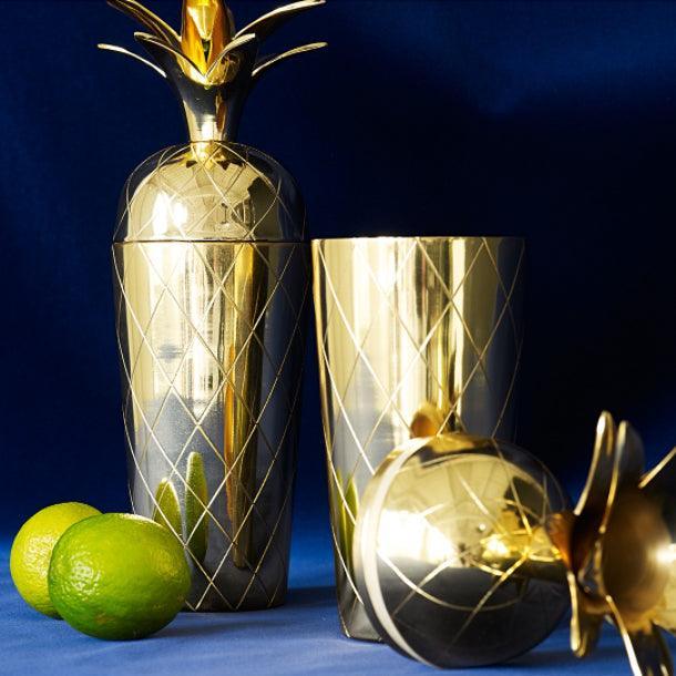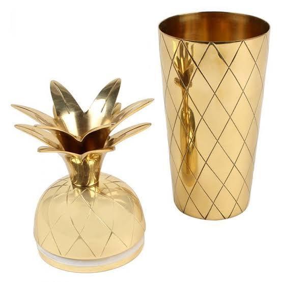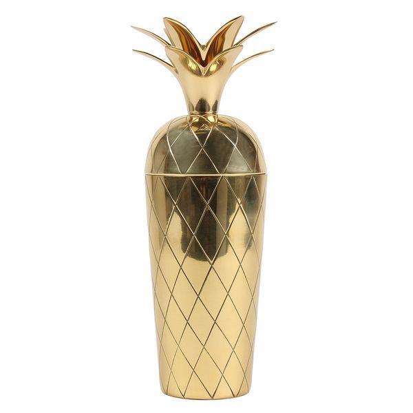 Miami Gold Pineapple Cocktail Shaker, Add a little classic Gatsby style to your next gathering with this fabulous Golden Pineapple cocktail shaker! Make cocktail hour the highlight of the day with this Pineapple Cocktail Shaker. Whether shaken or not, this metallic gold cocktail shaker with a pineapple top is a conversational piece to place on your bar trolley.