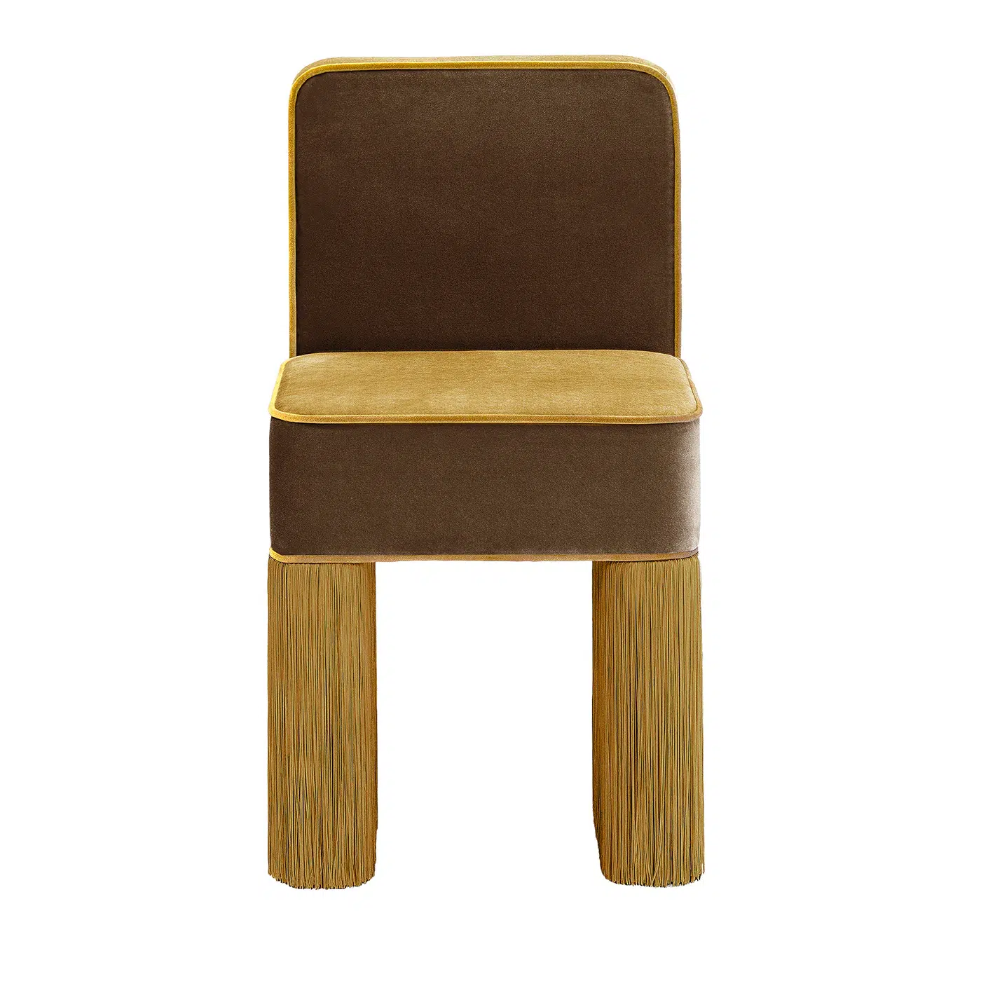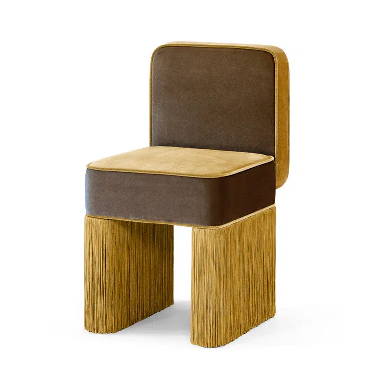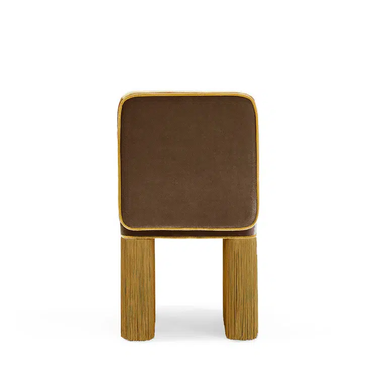 Thie Milan Finge Chair exudes elegance and sophistication with its perfectly square shape, measuring 40 cm x 40 cm with a seat height of 46 cm. The clean, geometric lines give it a minimalist yet refined aesthetic, ideal for interiors with a touch of class. Upholstered in solid Mocha velvet, with Honey velvet detailing and piping, it offers a soft-to-the-touch surface that enhances its luxurious character. The smooth, compact velvet adds a subtle and sophisticated feminine touch. A decorative tone-on-tone fringe runs along the entire perimeter of the base, creating a sense of movement and visual lightness. These fringe details soften the squared shape, transforming the chair into a striking and eye-catching statement piece.