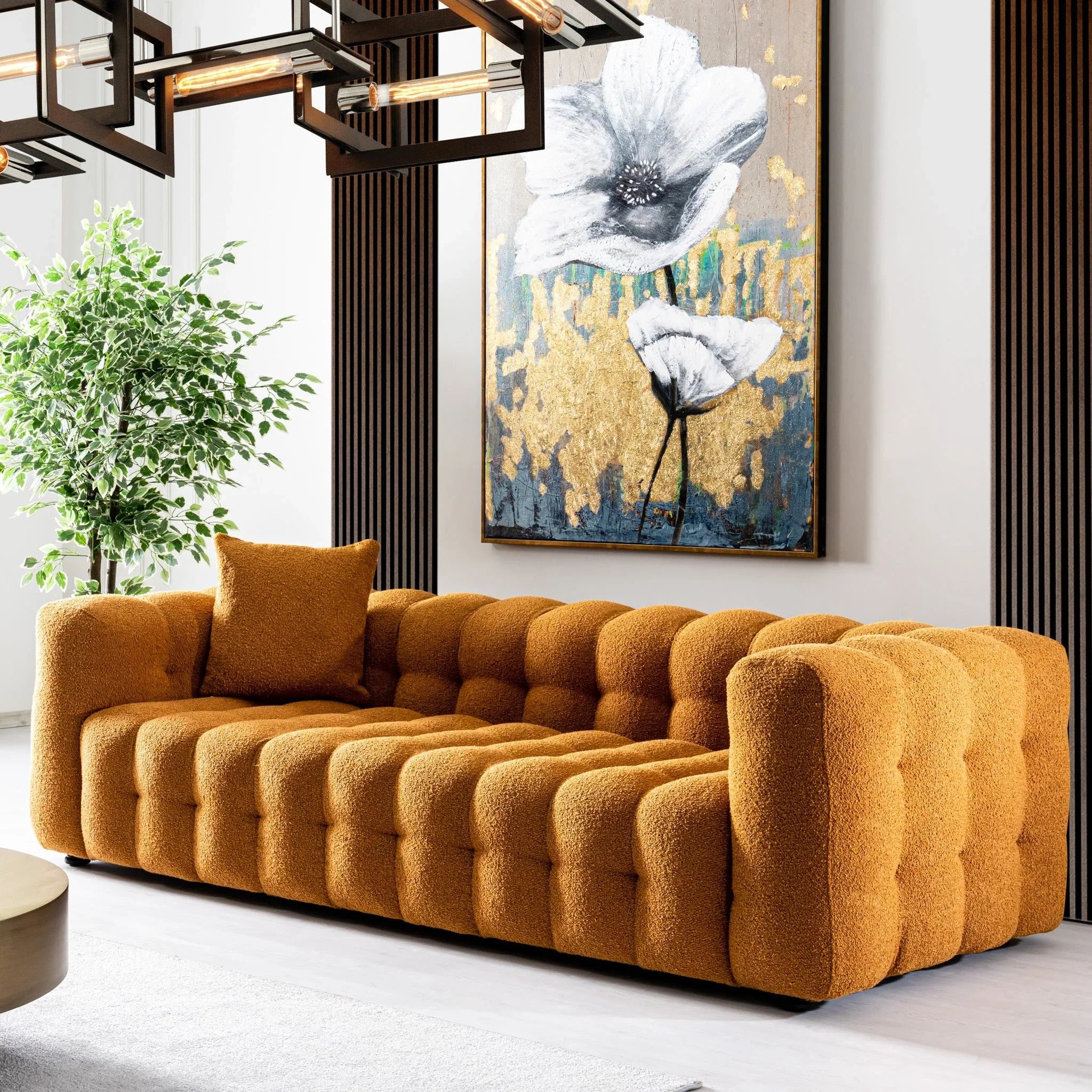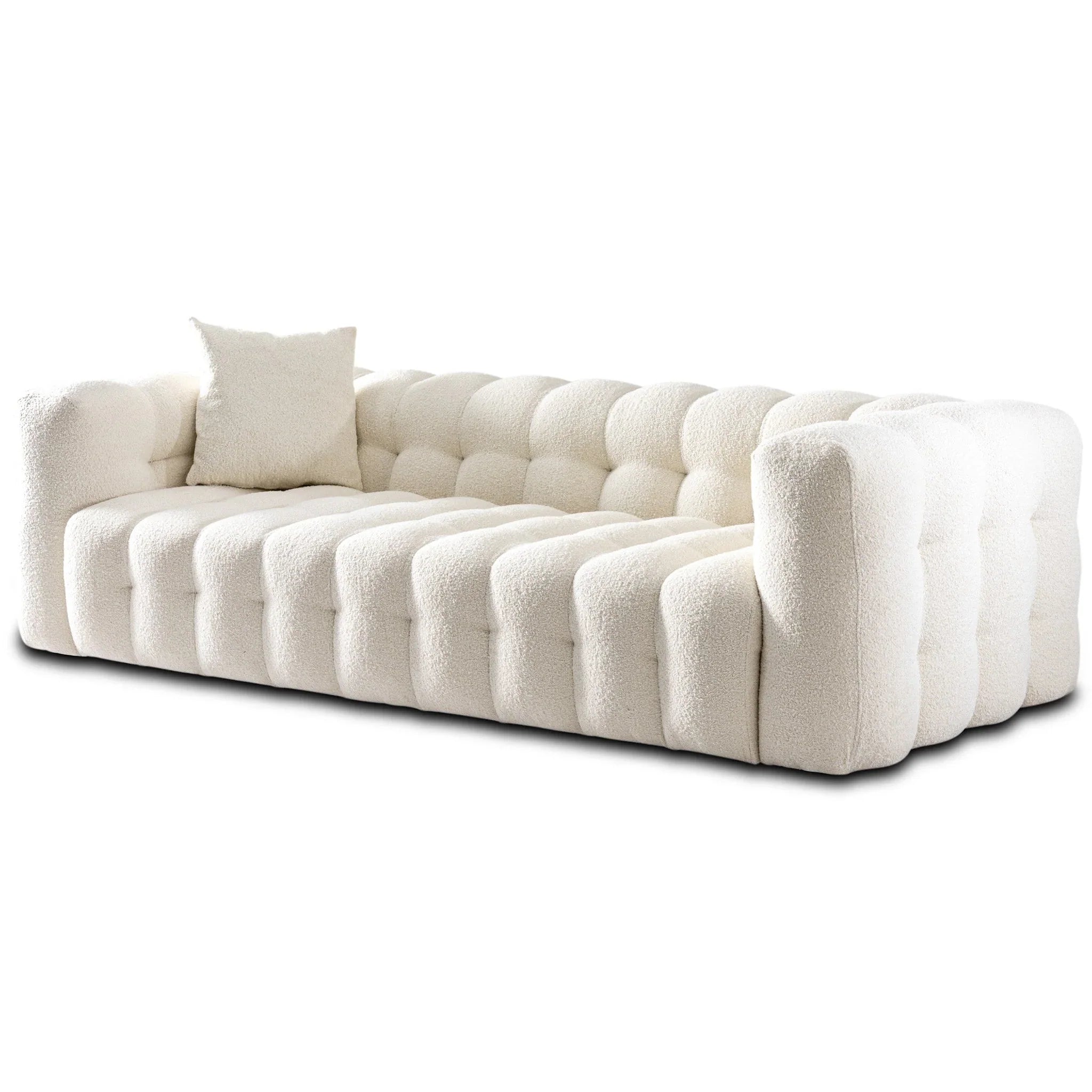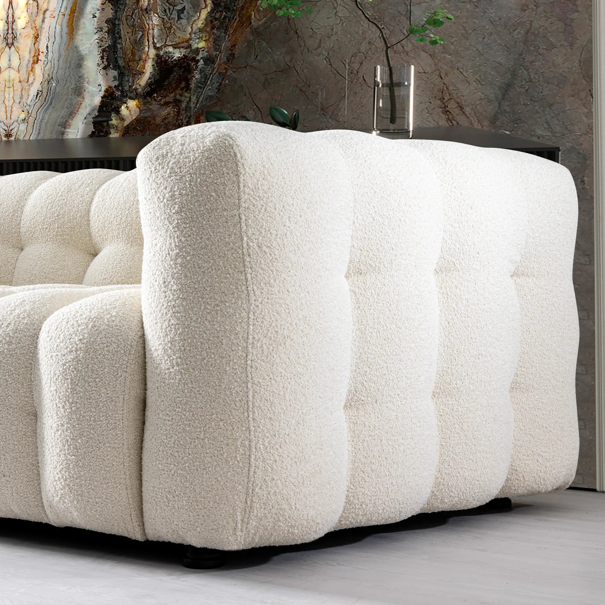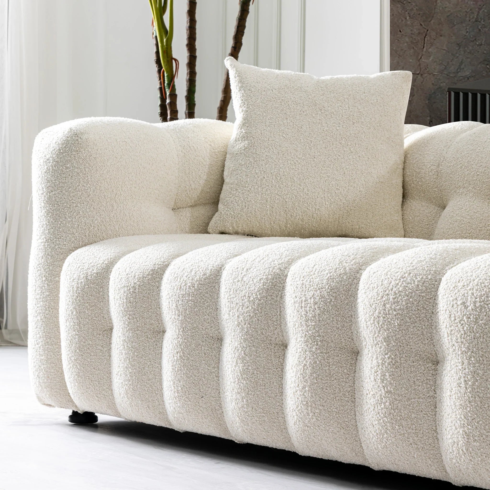 This designer style French boucle sofas creates an inviting space for your guests or family entertainment activities. Combining top-quality craftmanship and high-density foam, this set will provide you with great comfort and undoubtedly become the centerpiece of your apartment , living room, den, urban loft, condo. Available in a wide range of French boucle fabric finishes. Custom size and fabric options available.