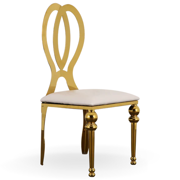 The Monarch Chair features a polished gold finish and white velvet cushion. The chair back has beautifully arched back reminiscent of a butterfly or crown.