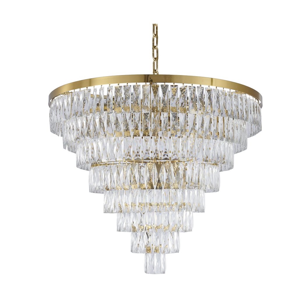This eight-tier exquisite chandelier is in a polished gold finish. The frame is made out of 304 stainless steel metal, and it comes with clear hanging crystals. The chain link can be adjustable, and you can create a timeless feel while using modern forms.