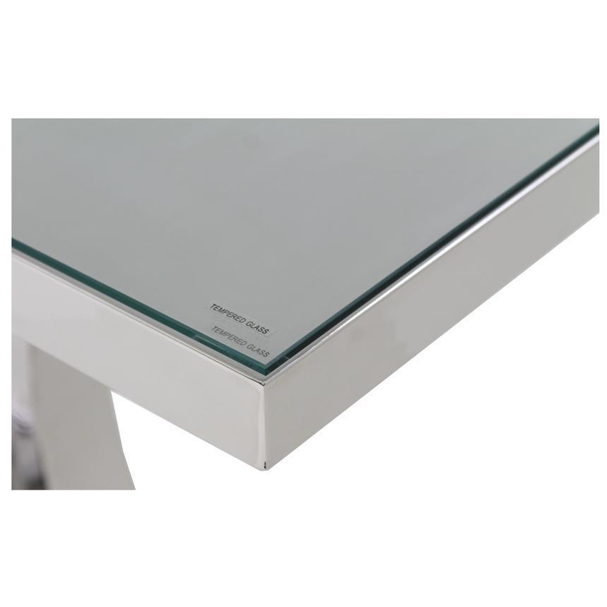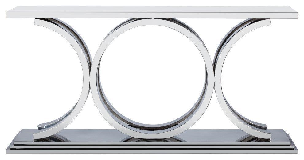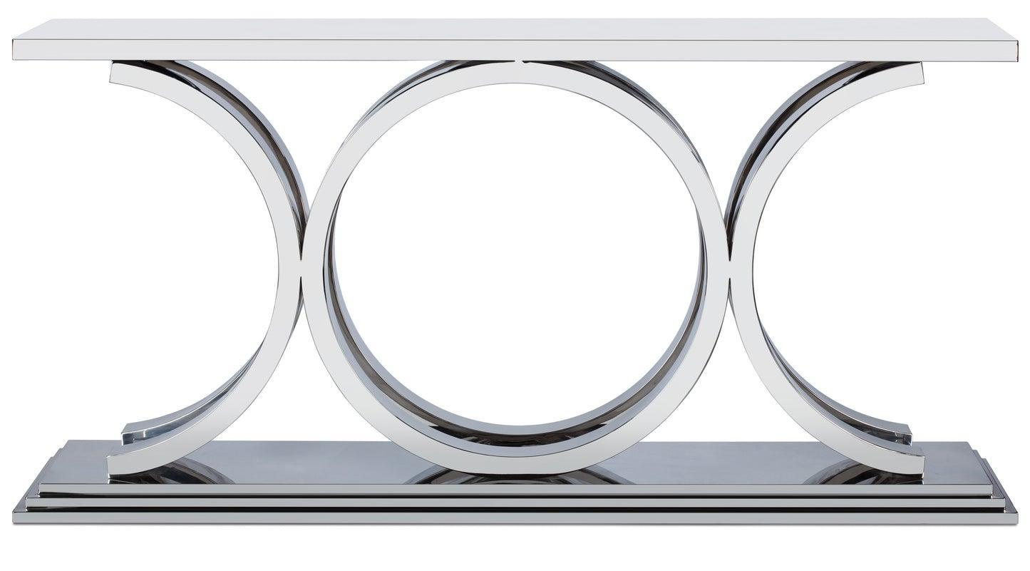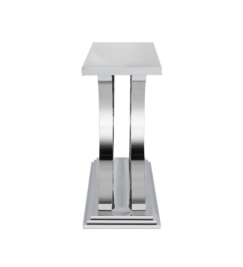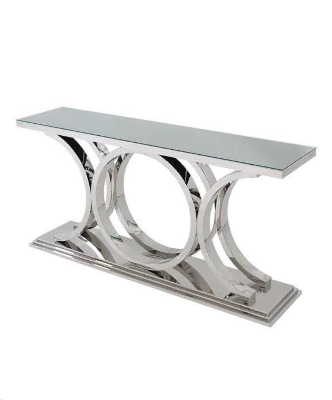 A bold, modern rendition of the everyday console table, this striking piece is an interesting mix of stainless steel and bold shapes. Featuring a full polished stainless steel body, this console table delivers big on both function and style. Clear glass top included