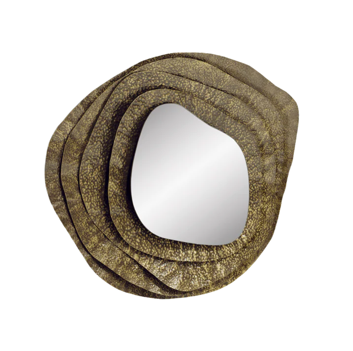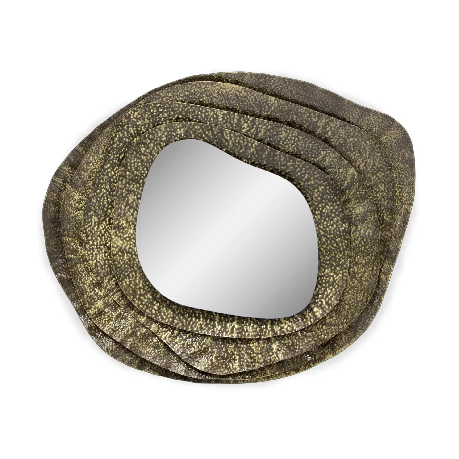 Montpelier Brass Large Mirror. Mirror Montpelier rectangular with structure in solid hammered brushed brass with a glossy finish, with 4 levelled frames. With irregular oval flat mirror glass.