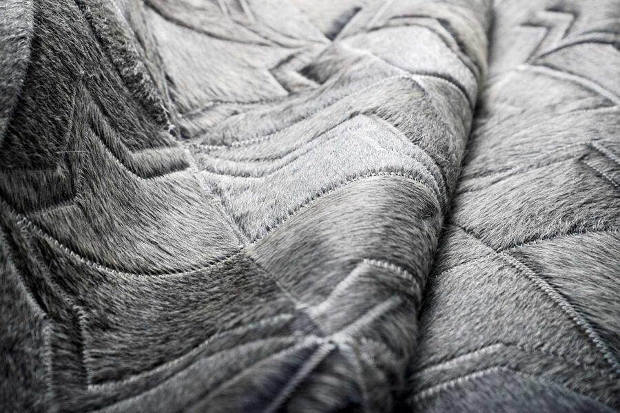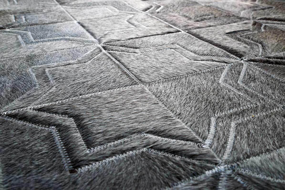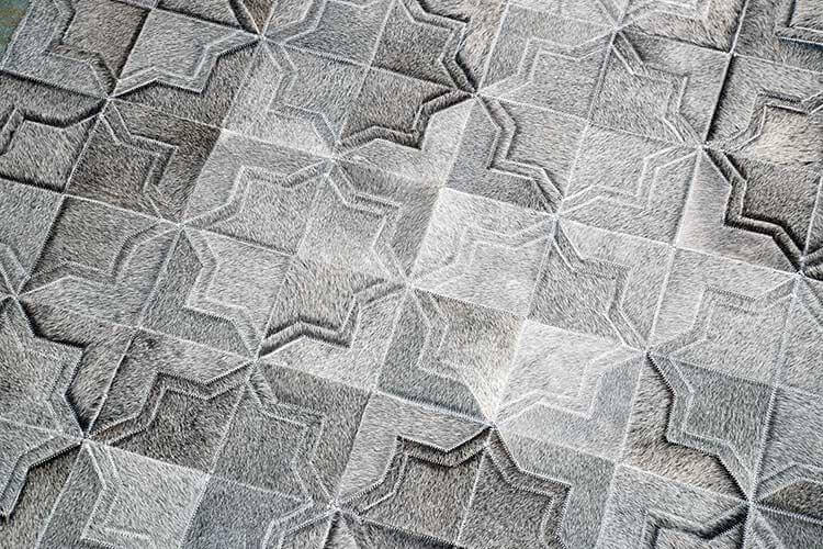 Complete your luxurious home with a classic, timeless and always fresh Moorish pattern in luxurious Grey wash. Using only ethically sourced high quality natural hides and crafted exclusively by exceptionally skilled leather experts, our cowhide patchwork rugs are finished with subtle and resistant zigzag stitching. This durable leather area rug keeps its natural soft suede on the back, giving it incredible grip to your floors without an under pad.