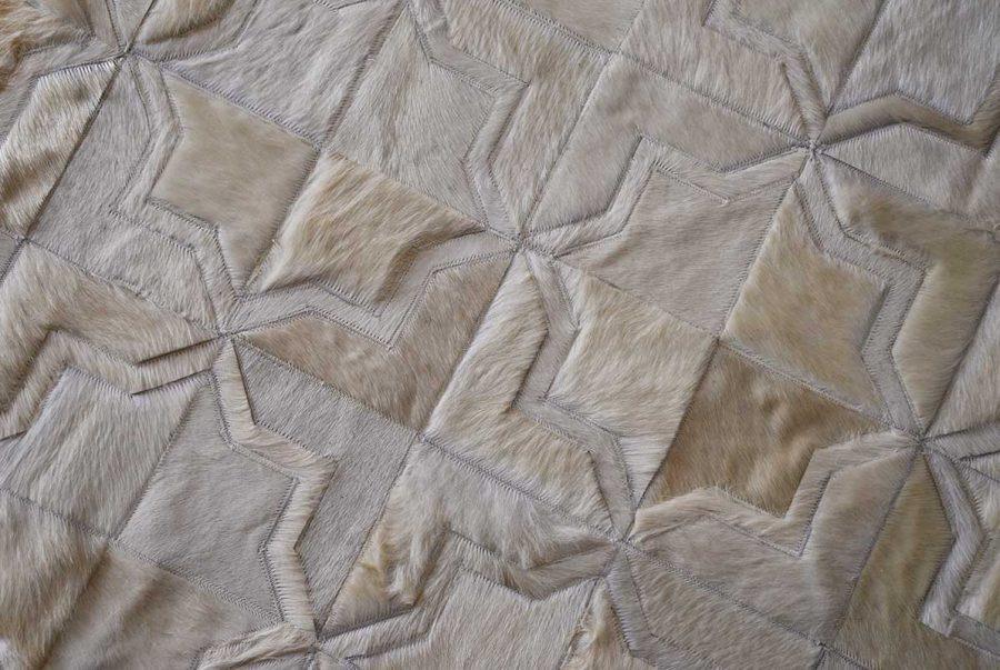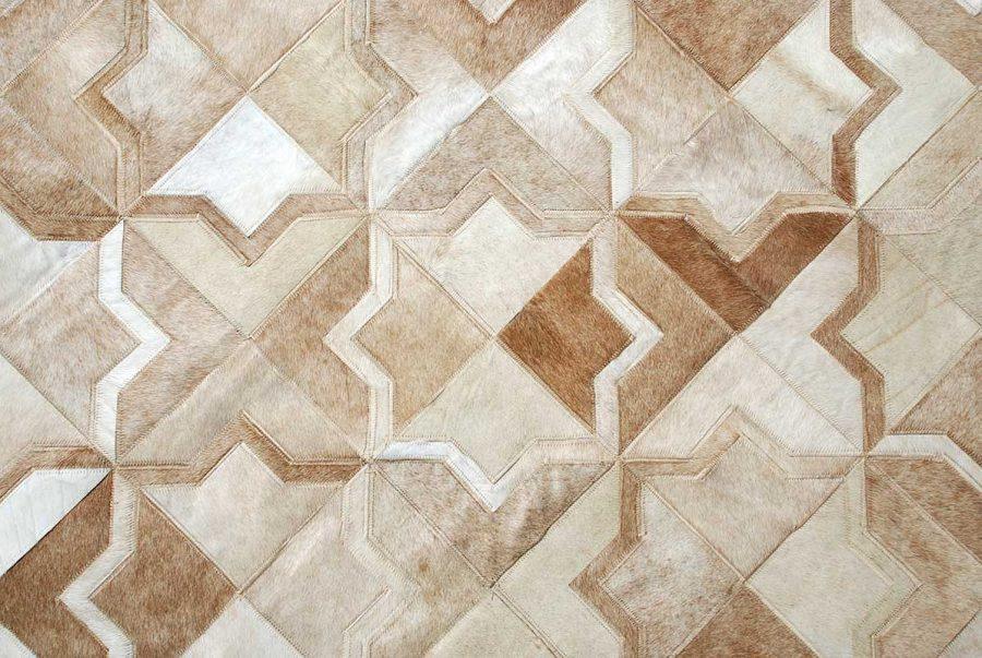 Complete your luxurious home with a classic, timeless and always fresh Moroccan pattern in Brown, ivory and soft creamy Beige. Using only ethically sourced high quality natural hides and crafted exclusively by exceptionally skilled leather experts, our cowhide patchwork rugs are finished with subtle and resistant zigzag stitching. This durable leather area rug keeps its natural soft suede on the back, giving it incredible grip to your floors without an under pad.