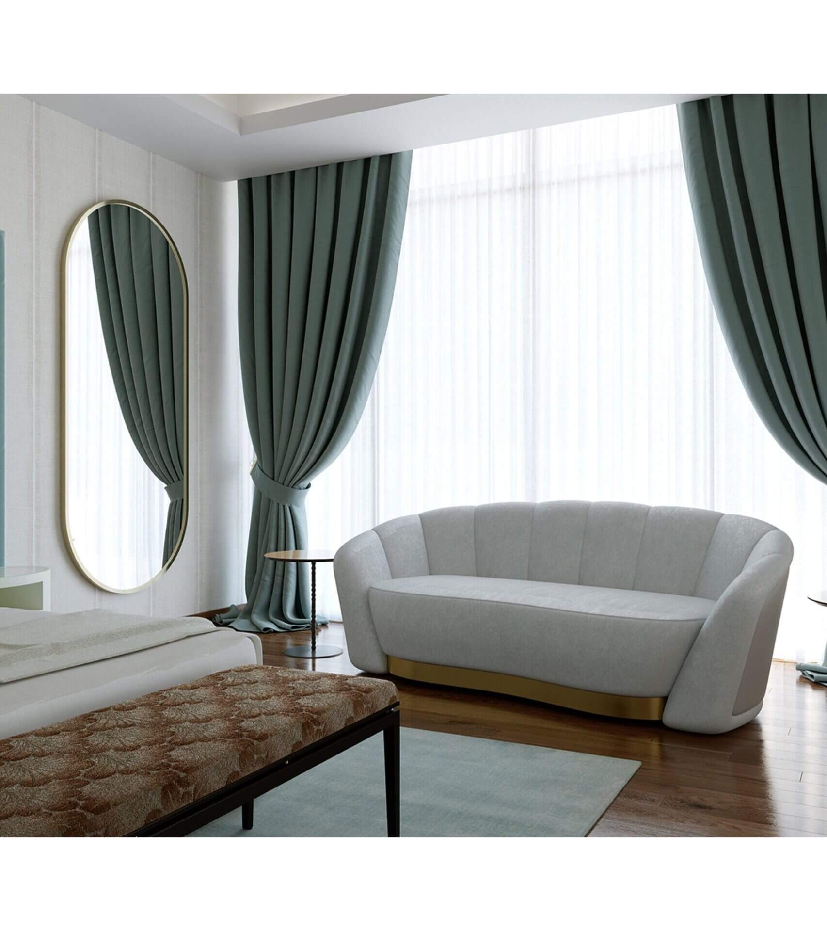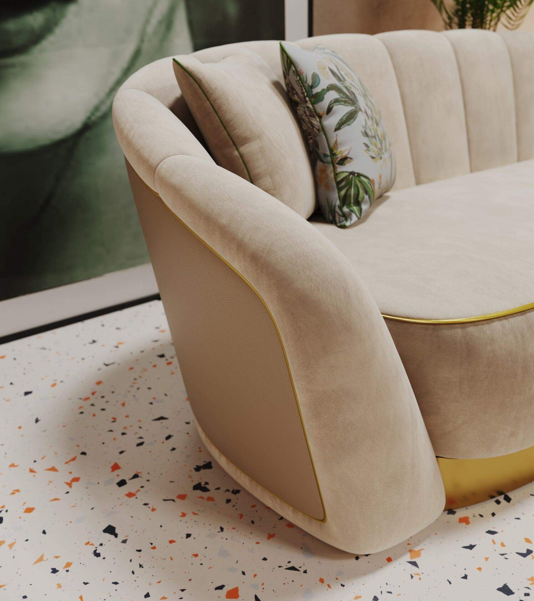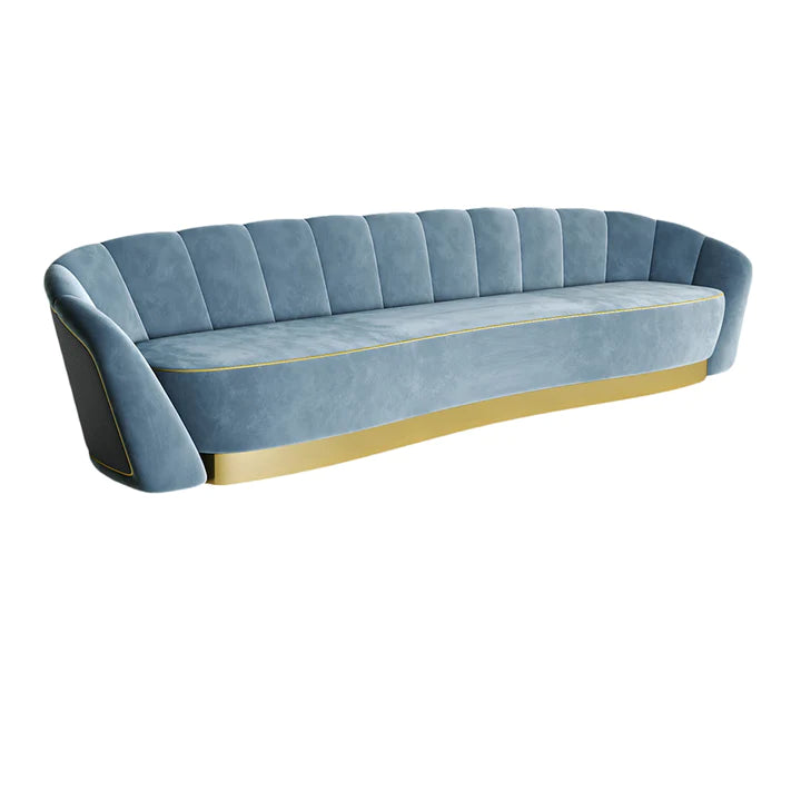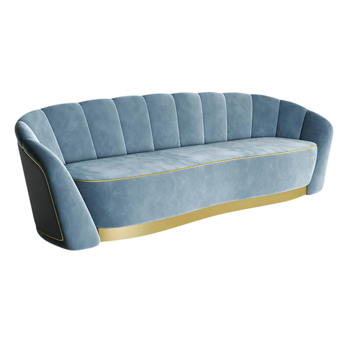 Mozart is the expression of perfect aesthetics, providing you with the best quality seating solution. Through its unique existence and shape this sofa determines its own history. Handsomely crafted from metal, it combines an avant-garde approach with classic and emblematic lines. The finish shown here is in a soft light blue velvet with gold detailing.