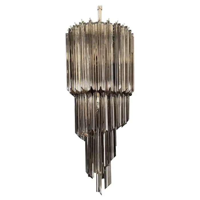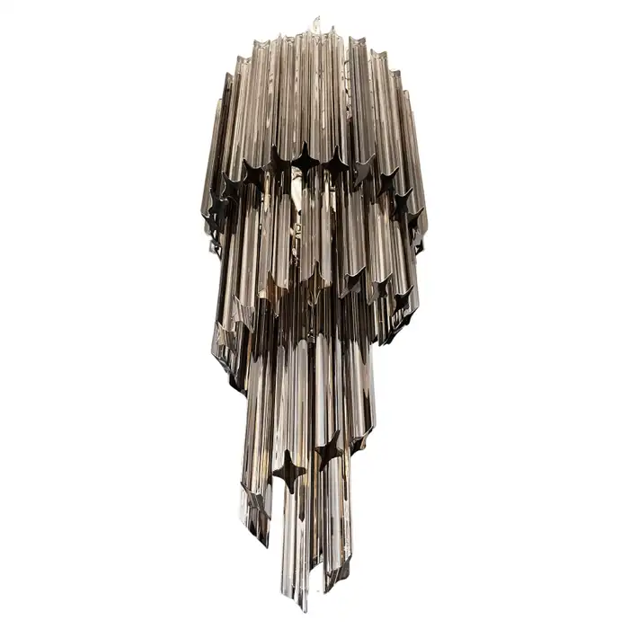 Looking for lighting that makes an impression? This is the one. From the practical, chunky chain and canopy, underneath we get to a spectacular arrangement of hanging crystal-glass cross-shaped tubes, formed into a mesmerising spiral to a single point at the bottom. This lighting is almost fantasy-like in its appearance, and is guaranteed to catch the eye without being overblown. We have some more of the same style chandeliers just not documented yet. Please do not hesitate to contact us for more information.