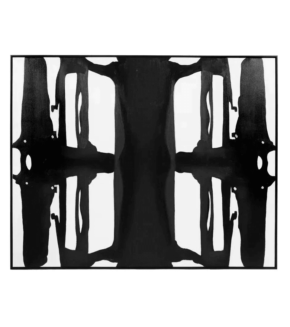 Mystic Forest Oil On Canvas Painting. A contemporary piece, the bold colour palette of black, white and charcoal grey in Mysterious Forest creates a striking composition. Open to interpretation, fluid forms are reflected, and deep tones combined with striking symmetry. Individually hand painted on linen canvas by skilled artisans, this substantial 150 x 120cm oil is beautifully displayed in a black shadow box frame.