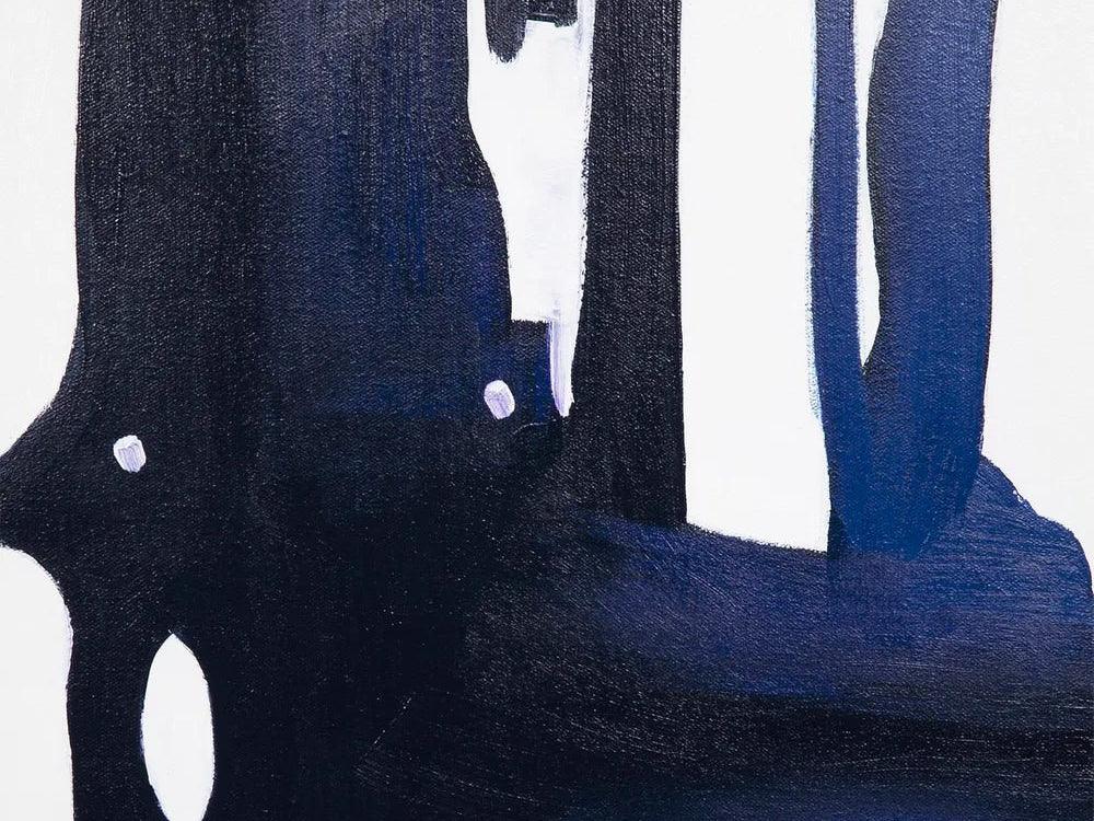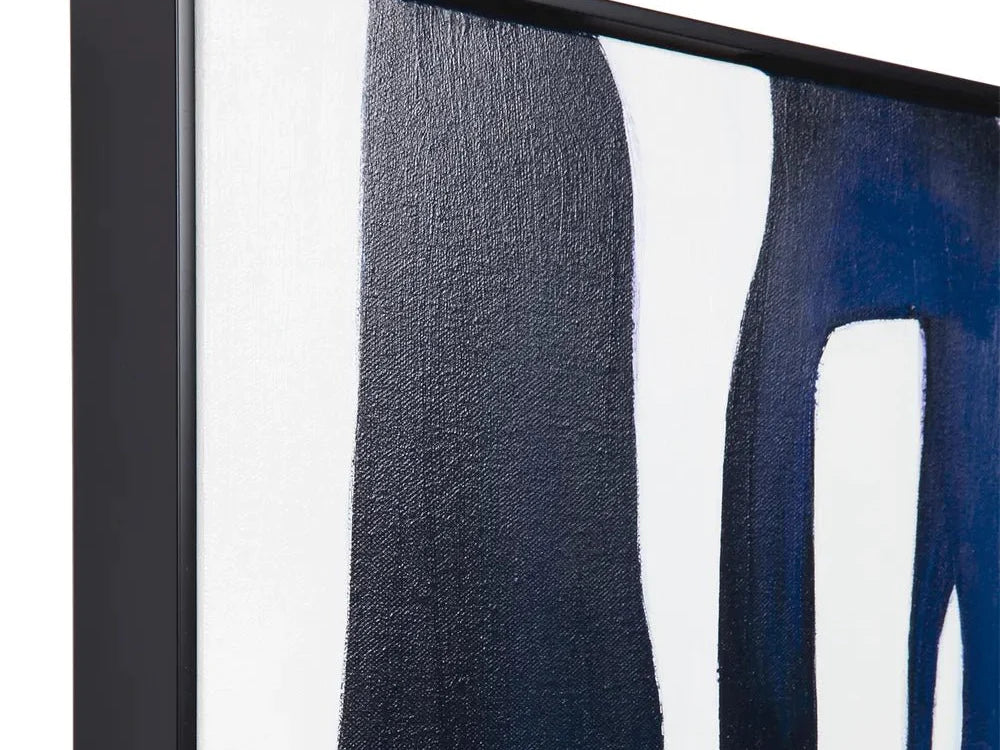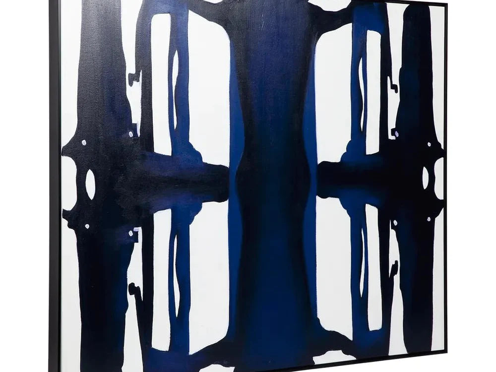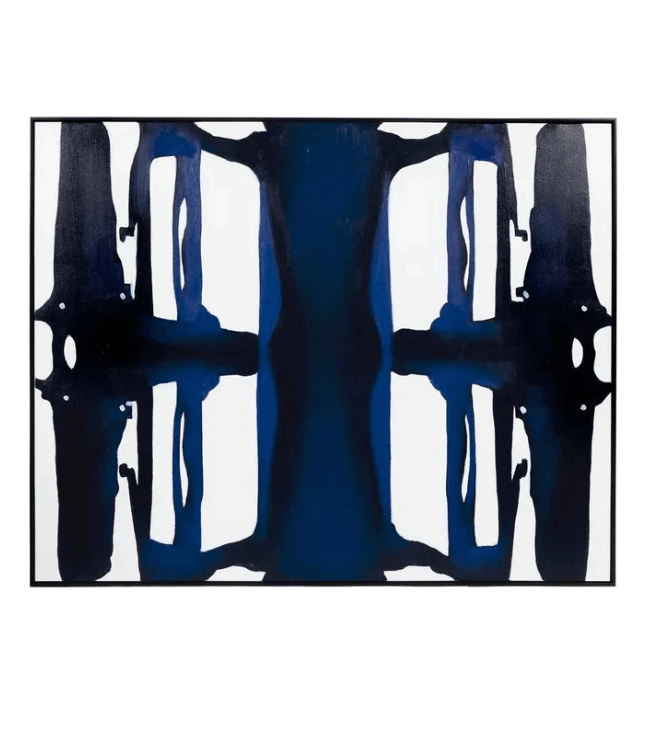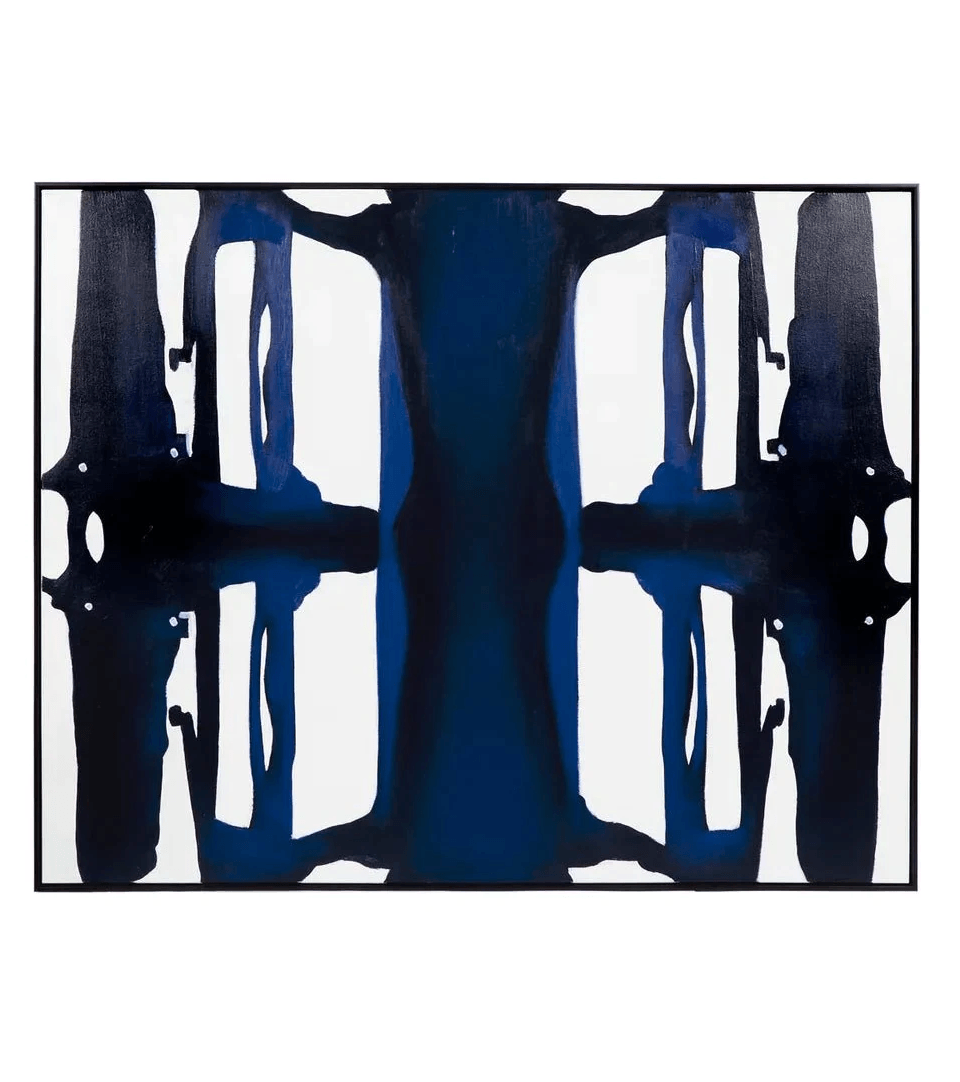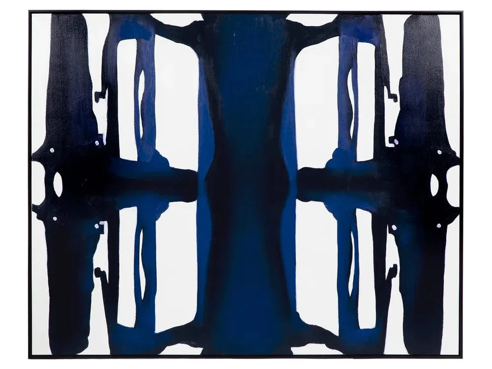 Mystic Forest Oil On Canvas Painting. A contemporary piece, the bold colour palette of black, white and inky indigo in Mysterious Forest creates a striking composition. Open to interpretation, fluid forms are reflected, and deep tones combined with striking symmetry. Individually hand painted on linen canvas by skilled artisans, this substantial 150 x 120cm oil is beautifully displayed in a black shadow box frame.