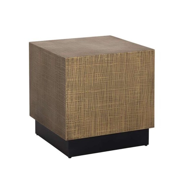 The Albans Side Table celebrates the beauty of handcrafted design. Constructed from iron with an antique brass finish, the structured tabletop features an intricate etched design. A black brushed metal base completes the look.