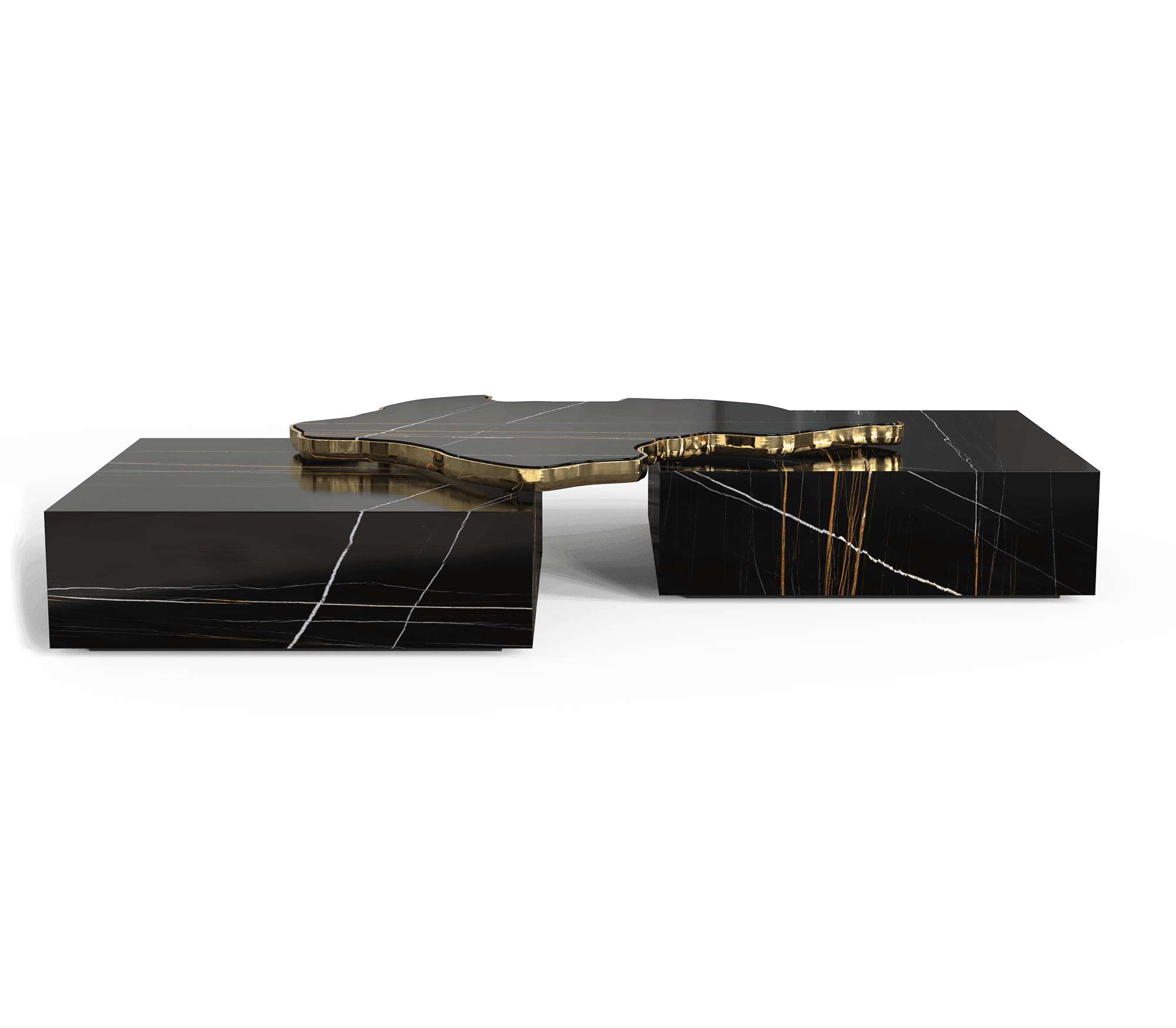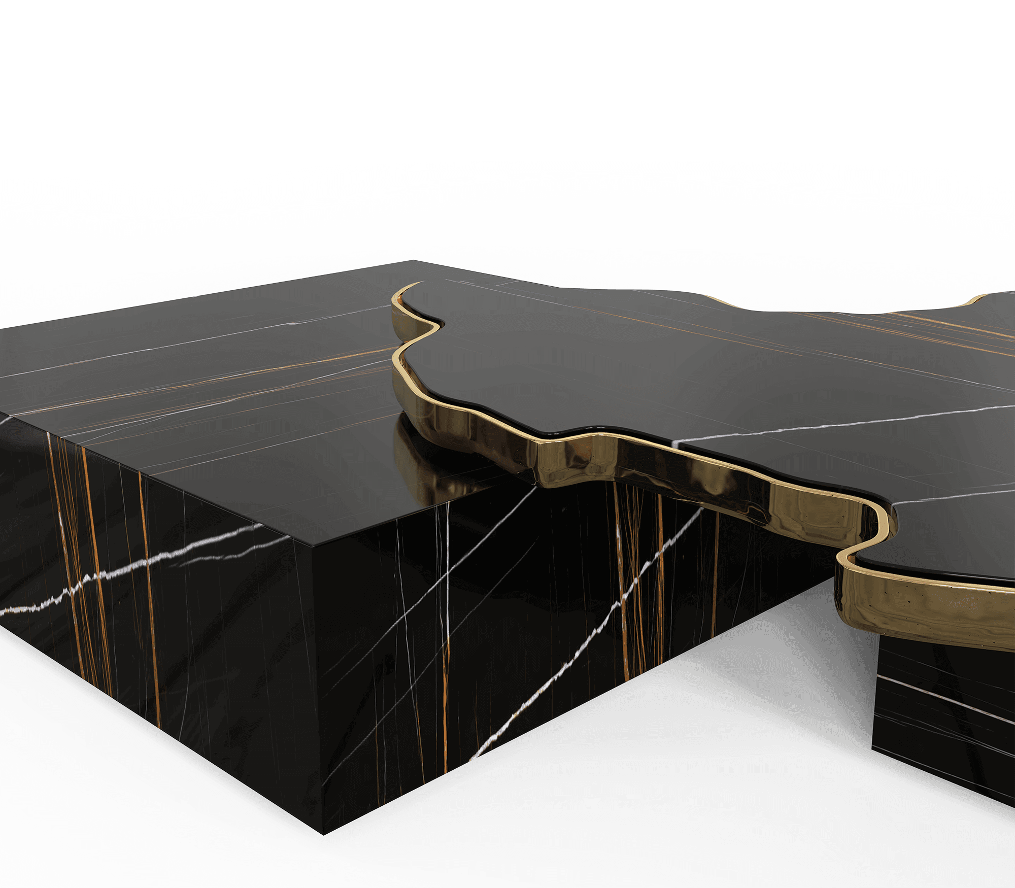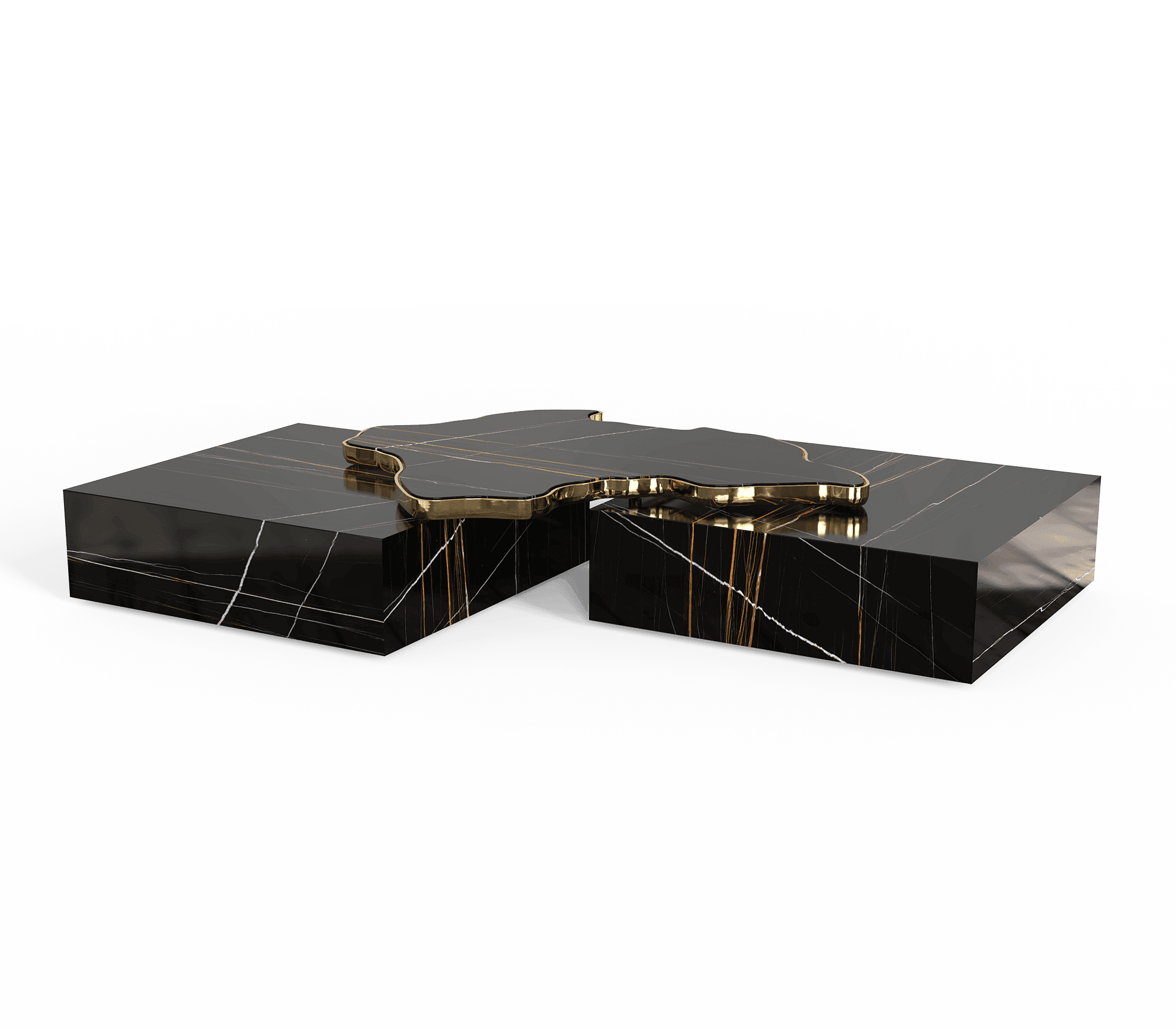 The rich colour background set off by thick and thin veins alike carries the eyes to the top of this table, framed by brass. Taking inspiration from its nature, the Vertigo coffee table brings an elegant flair into your home decoration. It is a contemporary center table composed by two square marble modules, linked by an organic marble surface element on top enveloped by casted brass. An exclusive design piece and polished choice for luxury home interiors. A contemporary center table composed by two square marble modules, linked by an organic marble surface element on top enveloped by casted brass.