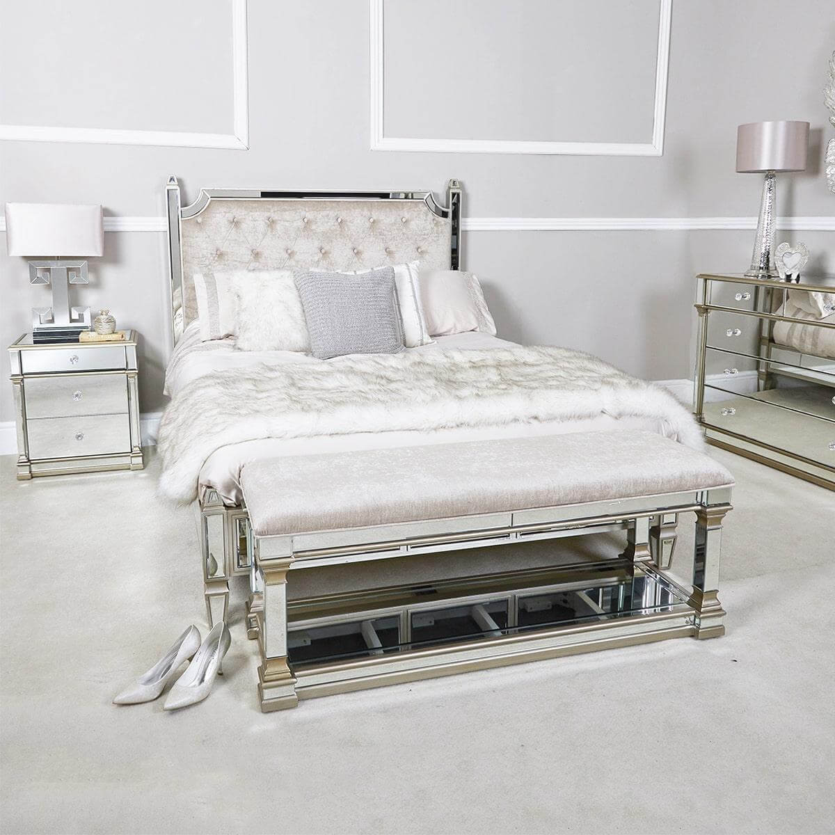 A combination of high grade reflective bevelled mirrors and hand painted gold make this collection an absolute winner. Hand made by traditional artisans using quality mirror glass and hand painted gold trims. Matching coffee table, side table, bedside table, ottoman and mirror available in this exclusive collection.