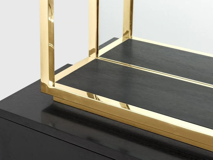Nobu Black Ash Polished Brass Stainless Steel Frame & Handles/Clear Glass Shelves/Mirror Back/Black Ash Wood Veneer Base. Handles are 100% hand-made item in metal. Each piece has different small variations and hand made related finishes including small welding points at junctions and not being completely straight, square or flush. These are the characteristic of the hand-made item and it is not a defect.