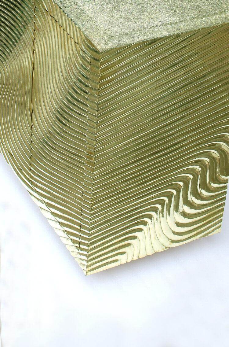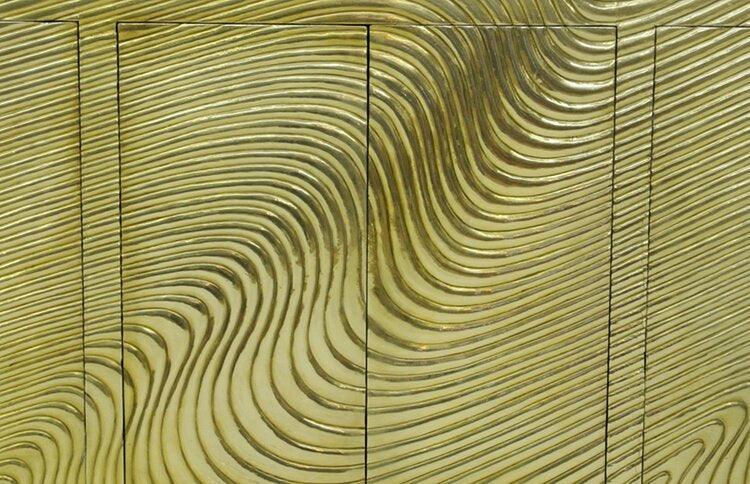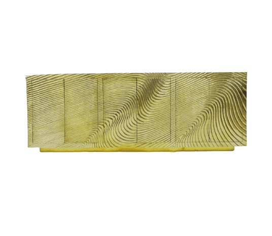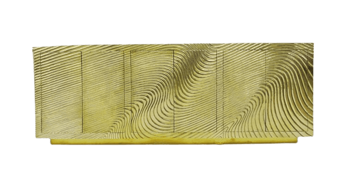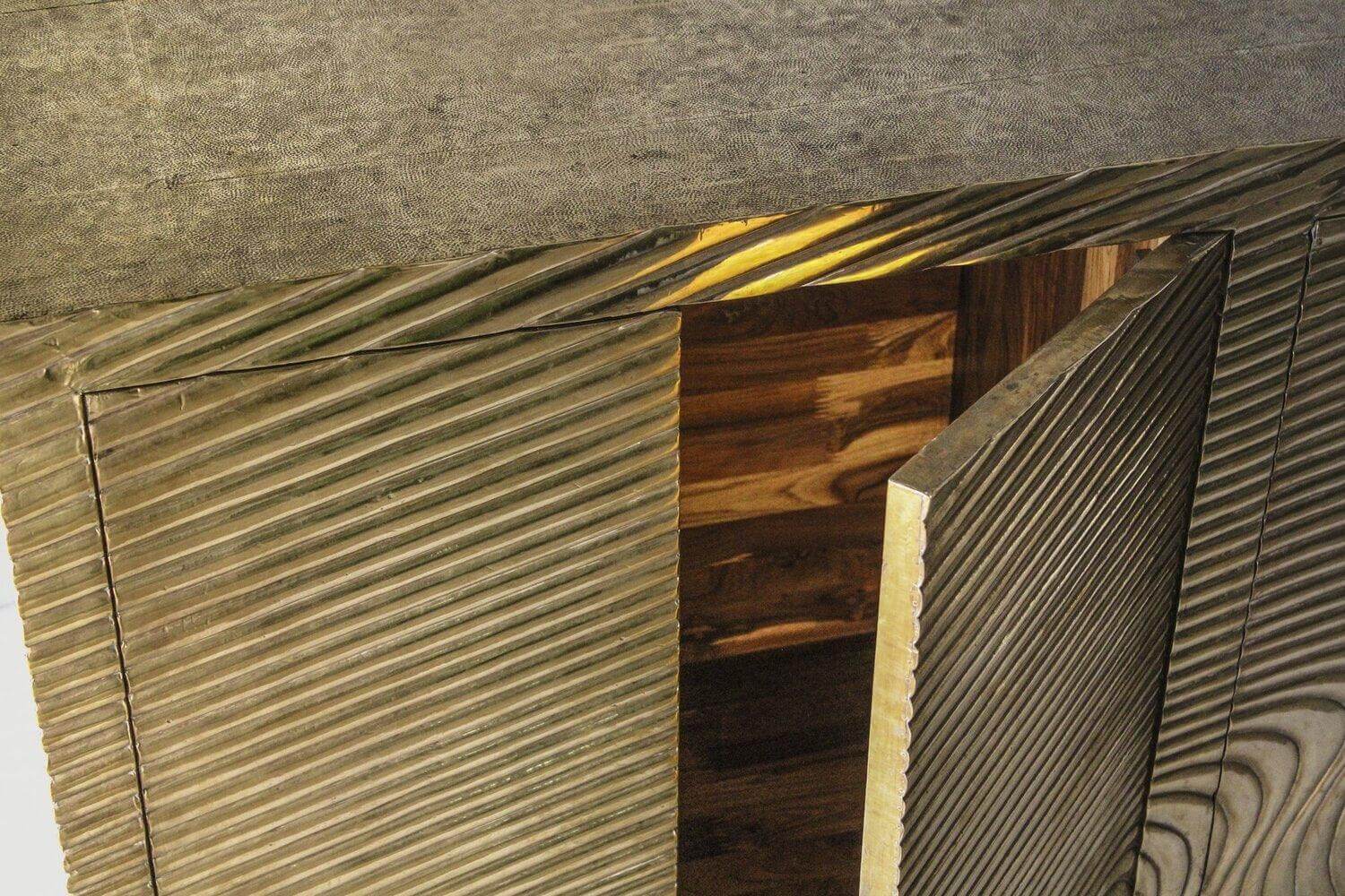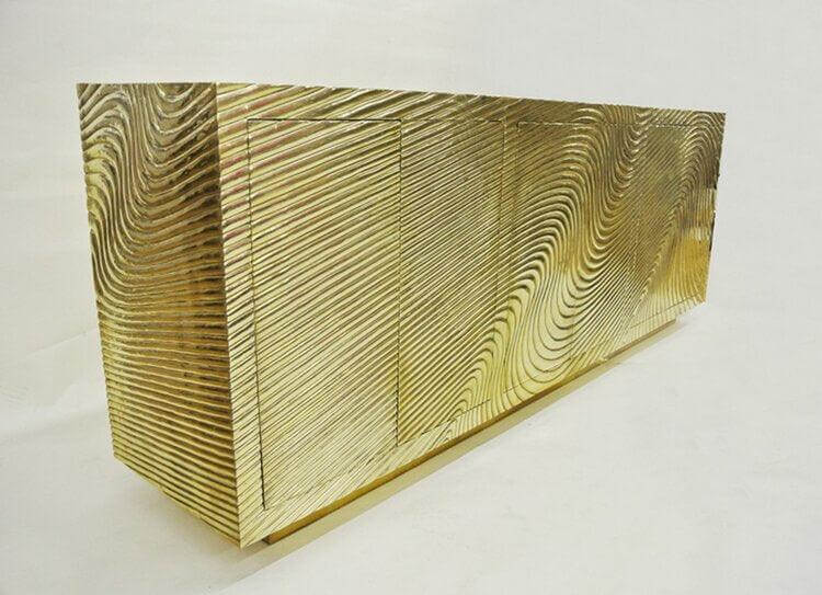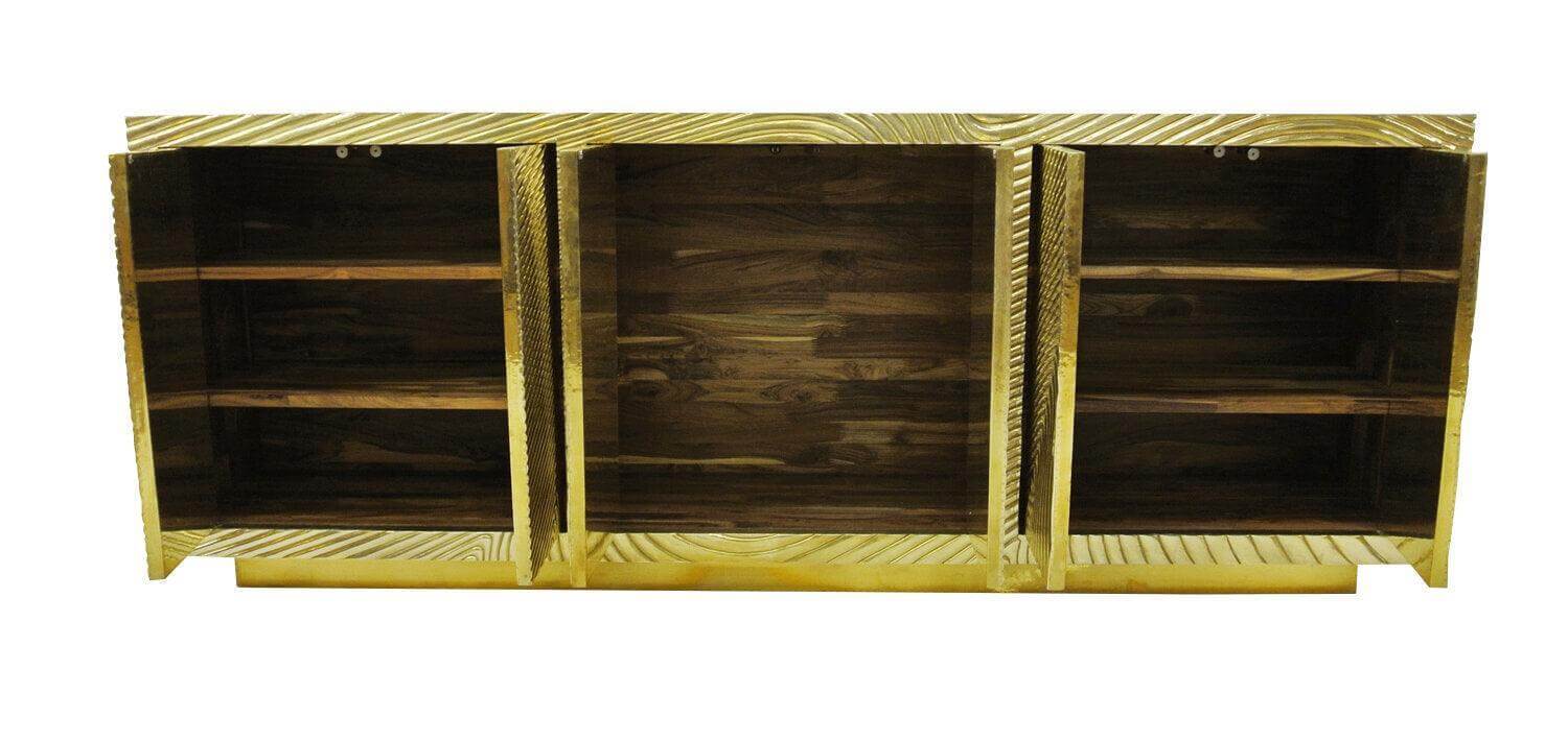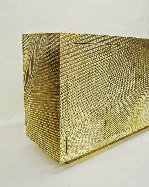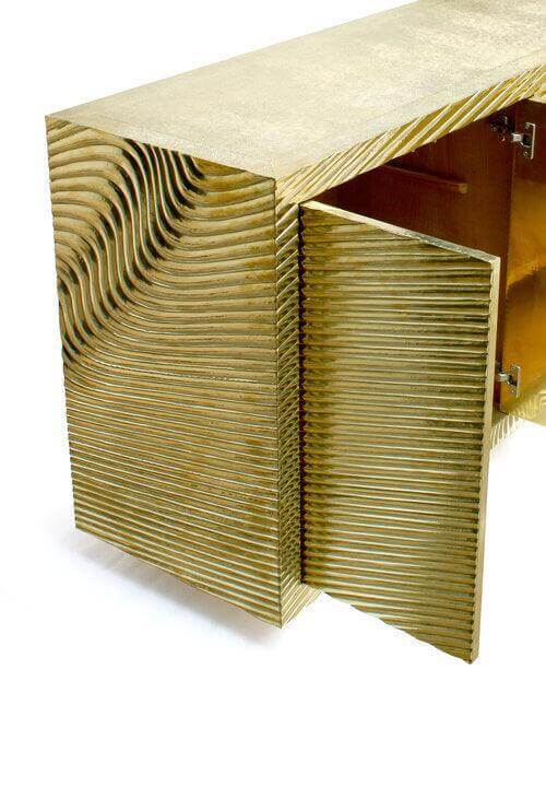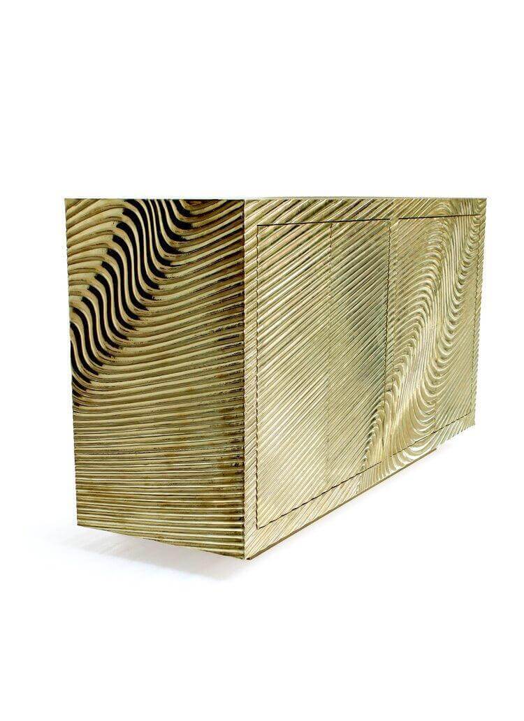 Inspired by the waves of the ocean, The Oceana Brass Buffet cabinet is hand made from solid ash hardwood which is joined to form the clean and elegant outline. The available options for metal cladding are brass, white bronze, antiqued bronze, silver and copper. Both silver and copper will tarnish over time. Handcrafted in India.