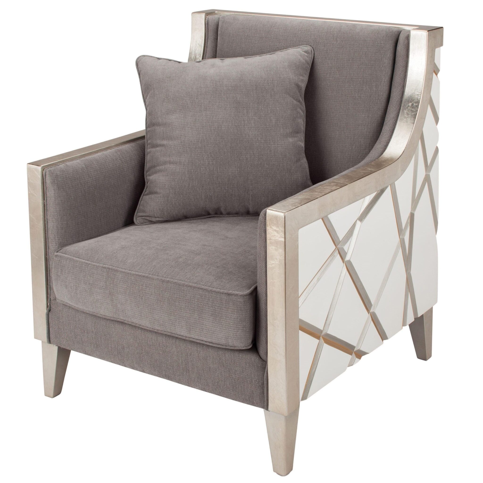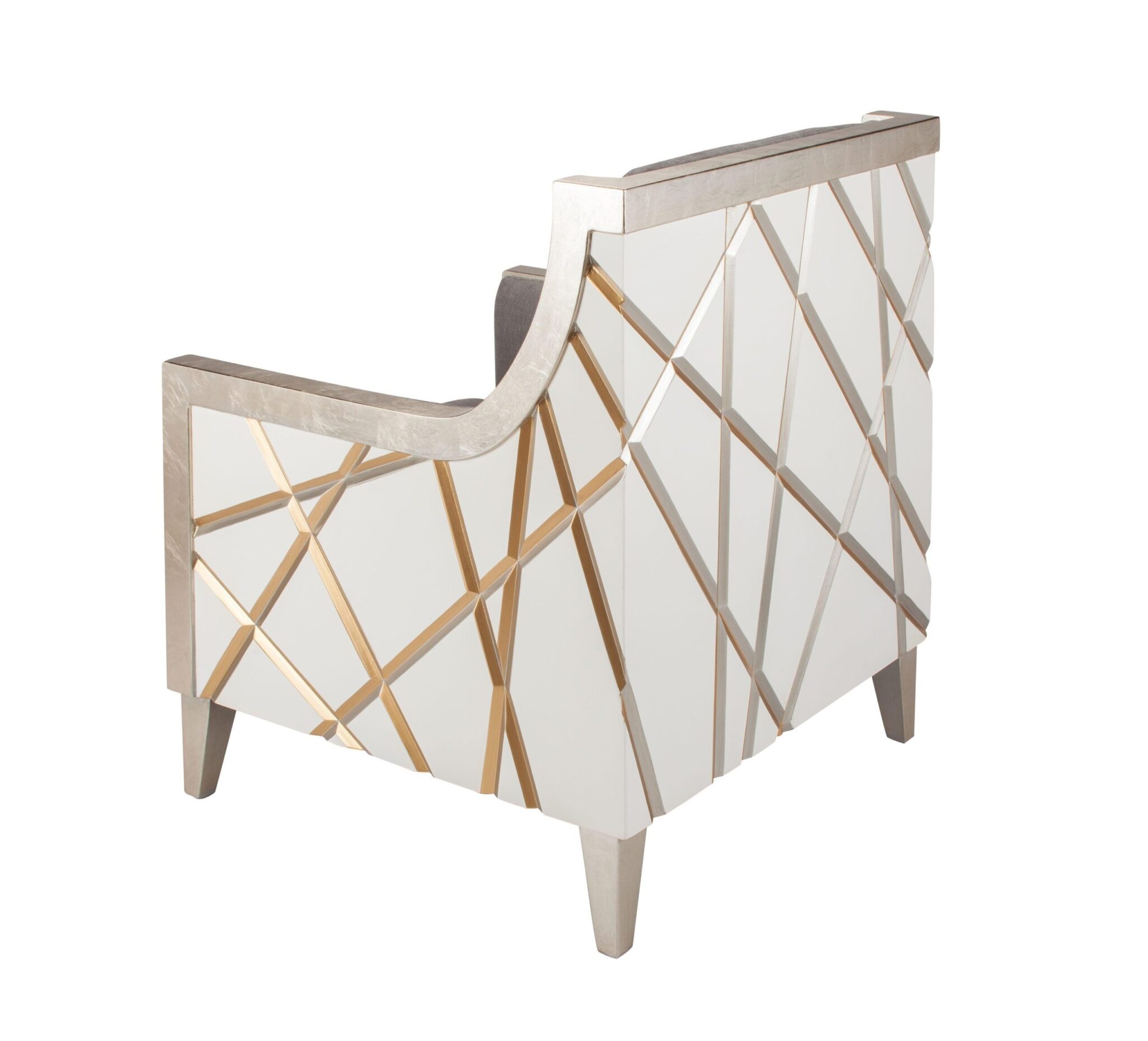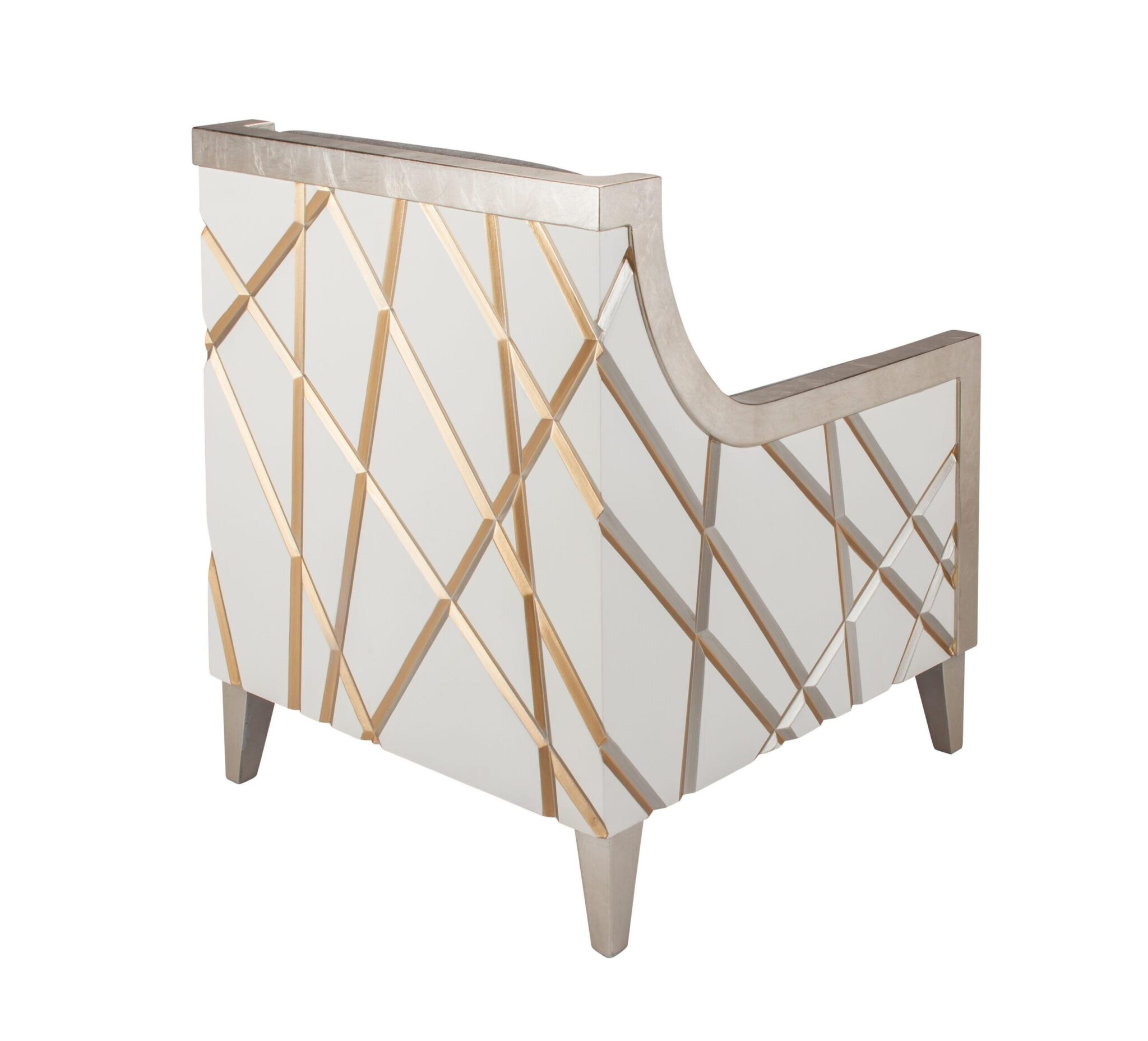 Featuring a unique pattern on the exterior back and sides in white, gold and silver, this magnificent occasional chair will be easy to display in almost any environment.