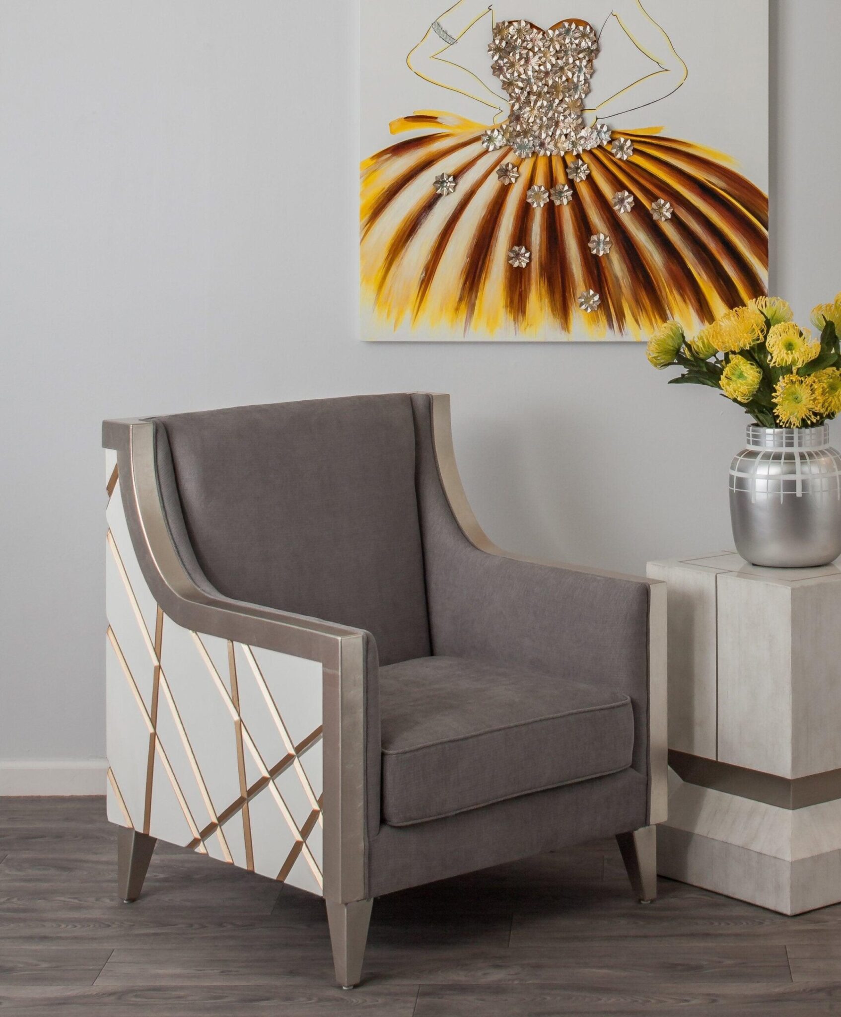 Finish: White, gold and silver with light champagne wash, gray seating