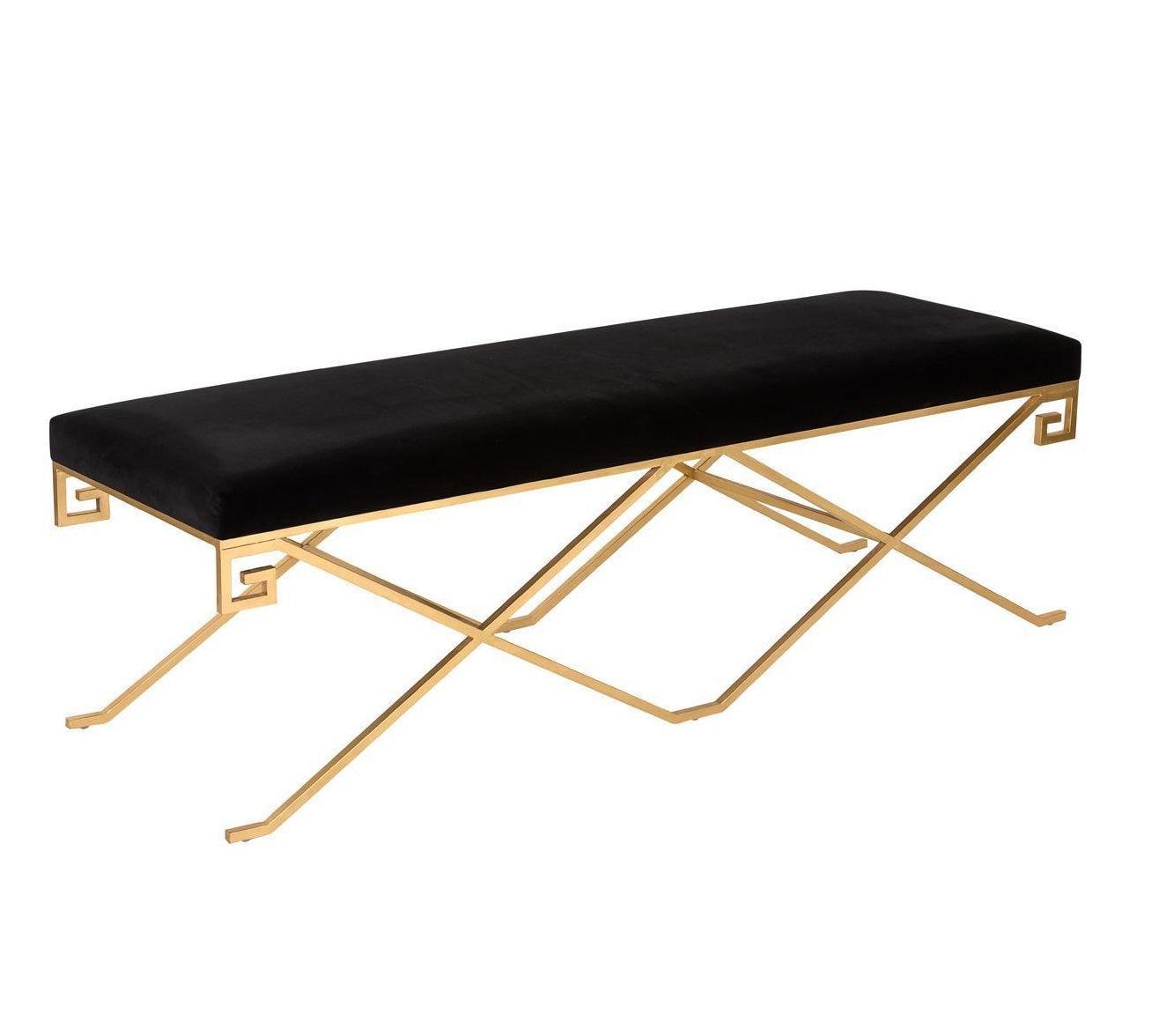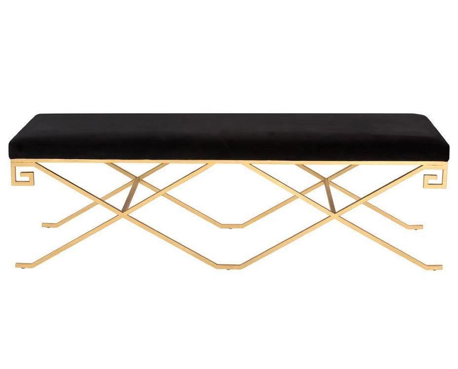 Sleek but luxurious, the black velvet Okino Bench combines tactile materials with an artful silhouette that floats on its airy base. Crafted of Polished gold metal with Greek Key detailing, it exudes grace, style, and extravagant comfort.