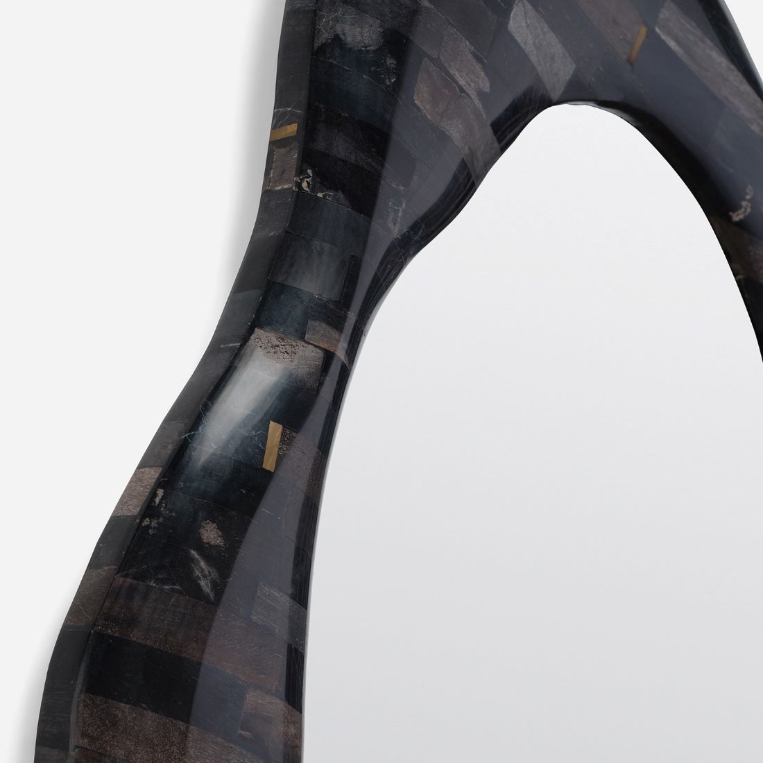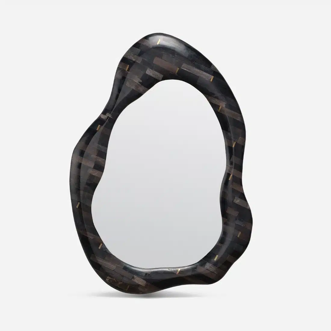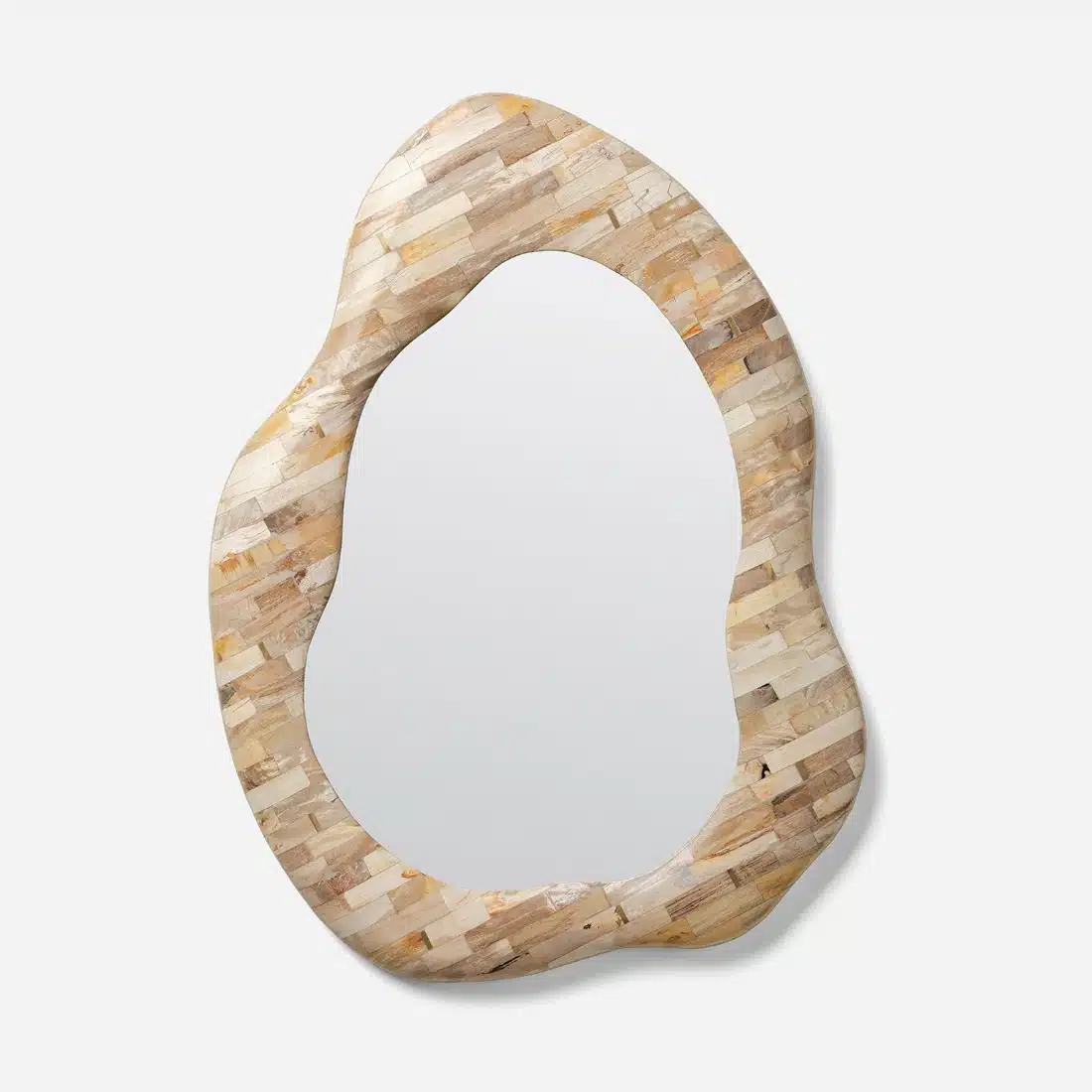 Asymmetrical Tiled Petrified Wood and Metal Frame Mirror. Available in Light or Dark Finish