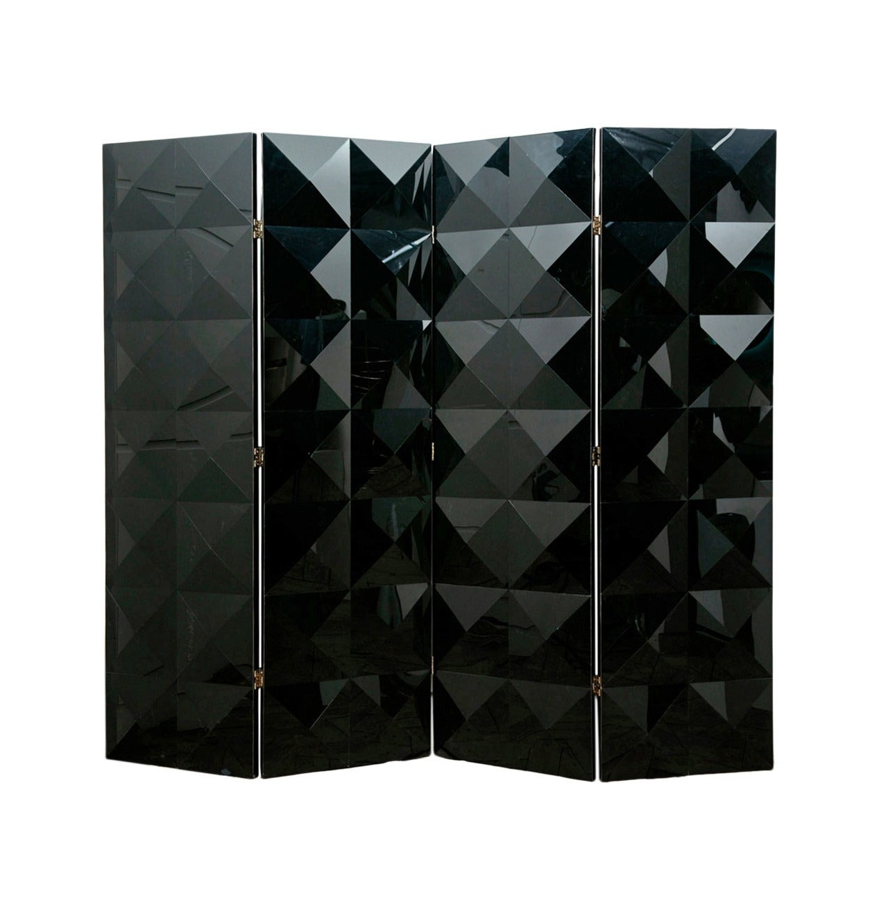 Polished Black metal pyramid folding screen room divider with 4 door finished in polished black metal.