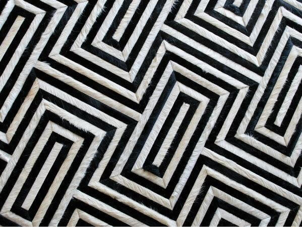 Complete your luxurious home with a classic, timeless and always fresh Opt pattern in Black and white. Using only ethically sourced high quality natural hides and crafted exclusively by exceptionally skilled leather experts, our cowhide patchwork rugs are finished with subtle and resistant zigzag stitching. This durable leather area rug keeps its natural soft suede on the back, giving it incredible grip to your floors without an under pad. Our Patch Hide Rug Design is made using only premium, high quality hides, and can be customized in any size and shape.