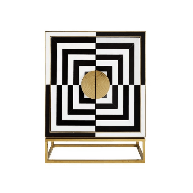 Our Optical modernist and mind-bending cabinet features glass panes reverse-painted in black and white with polished brass details. Grooved, split-circle door pulls add a glam spin. Fitted with adjustable tempered glass shelves, plus six wire-bound drinking glass shelves inside the doors.