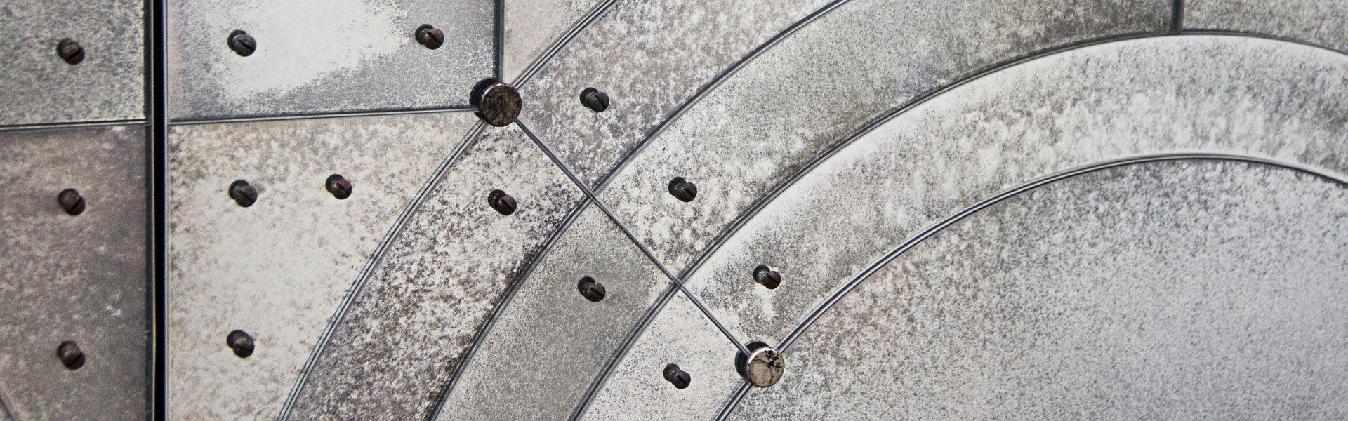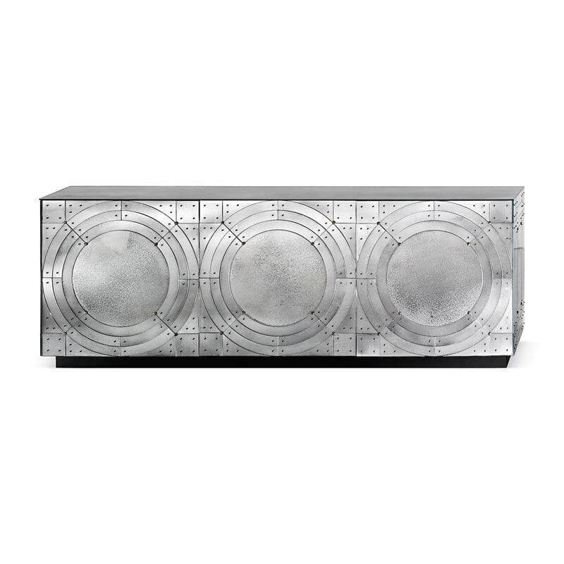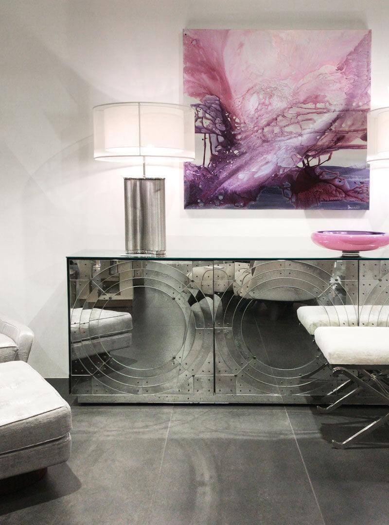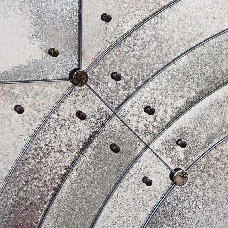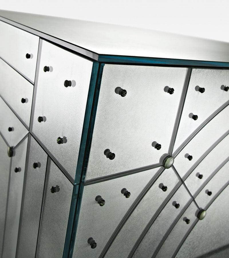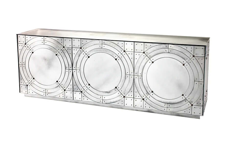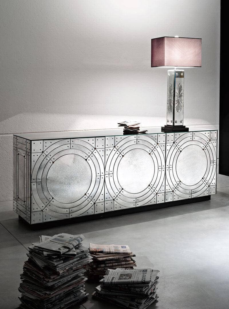 The orbital antique mirror buffet is made with Top, doors, sides and back made of beveled glass with medium antique mirrored finish. Screws and studs made of brass with antique finish. Unique handmade glass creations realized by our master artisans.