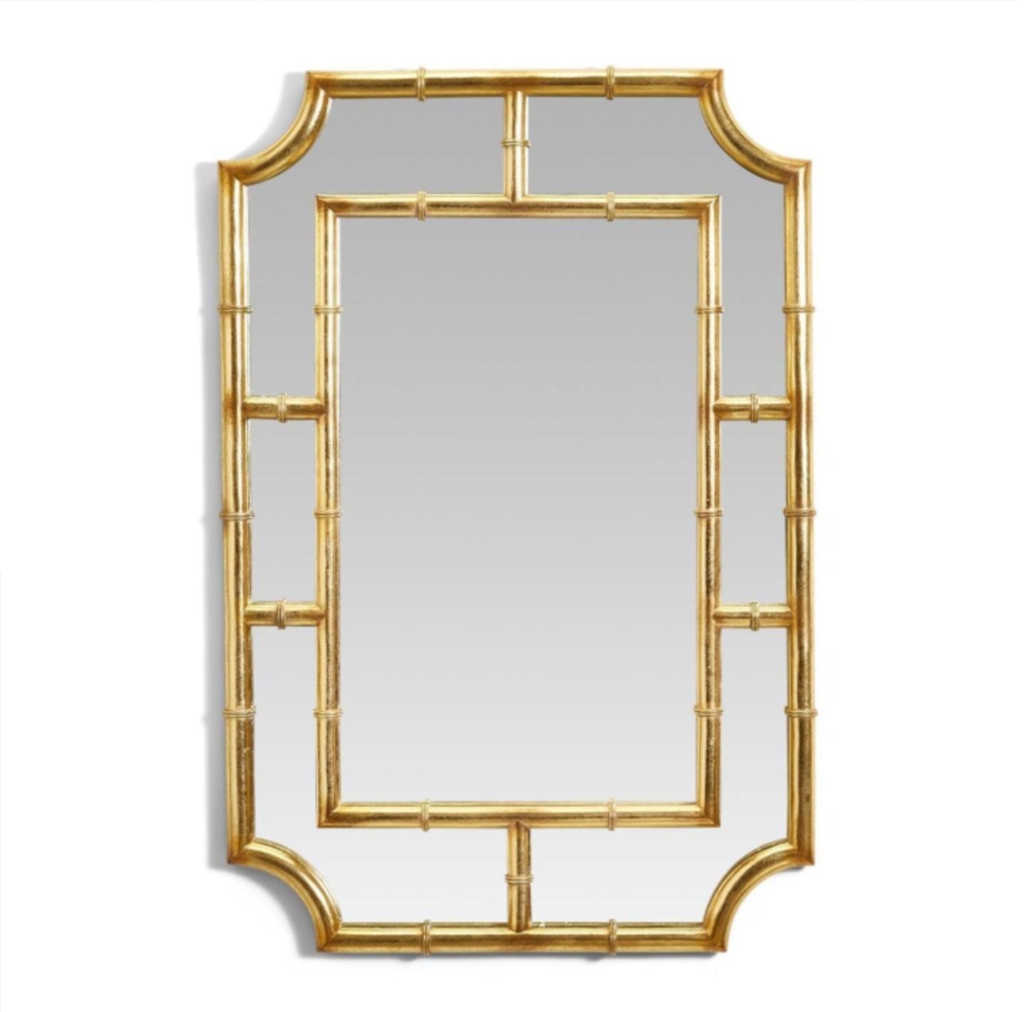 A polished gold metal bamboo frame gives this mirror its classic touch. It’s covered in a gold finish for a contemporary update that lets it fit in well in any space of the home. This mirror hangs horizontally or vertically and features a metal hanger on the back to easily hang on your walls. The ornate angles and cutouts of its design give this mirror a traditionally romantic look. The overall shape gives it an antique-like appearance that will complement most home decors.