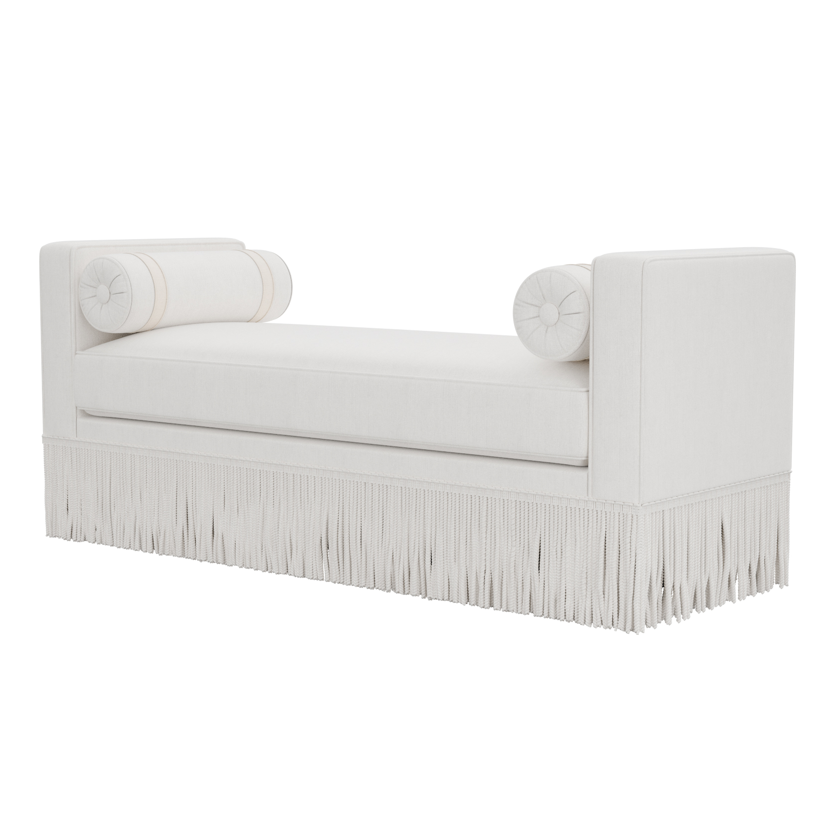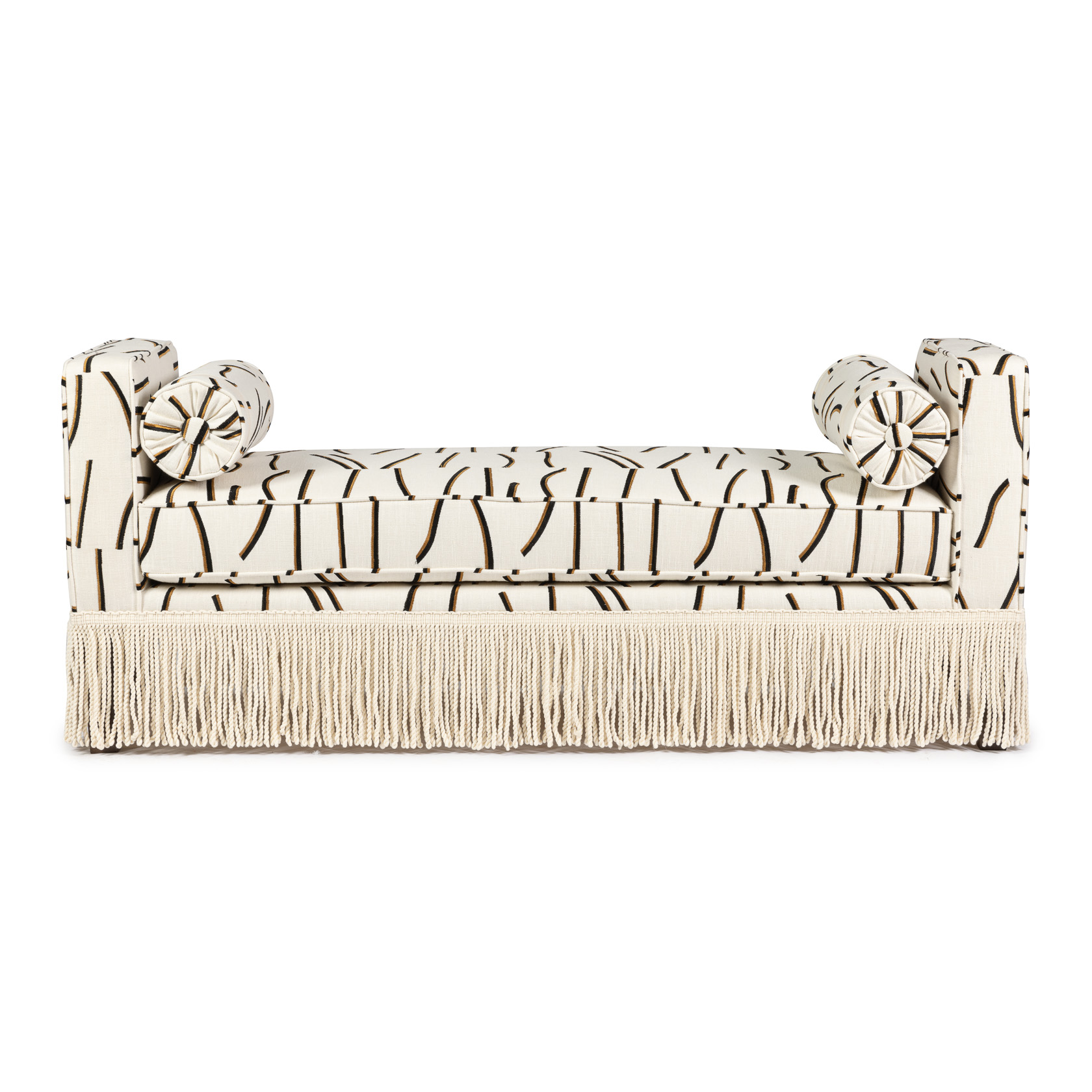 Orlando Cream Linen Bolster Fringe Bench with on trend patterned cream with black and brown stripe linen fabric.