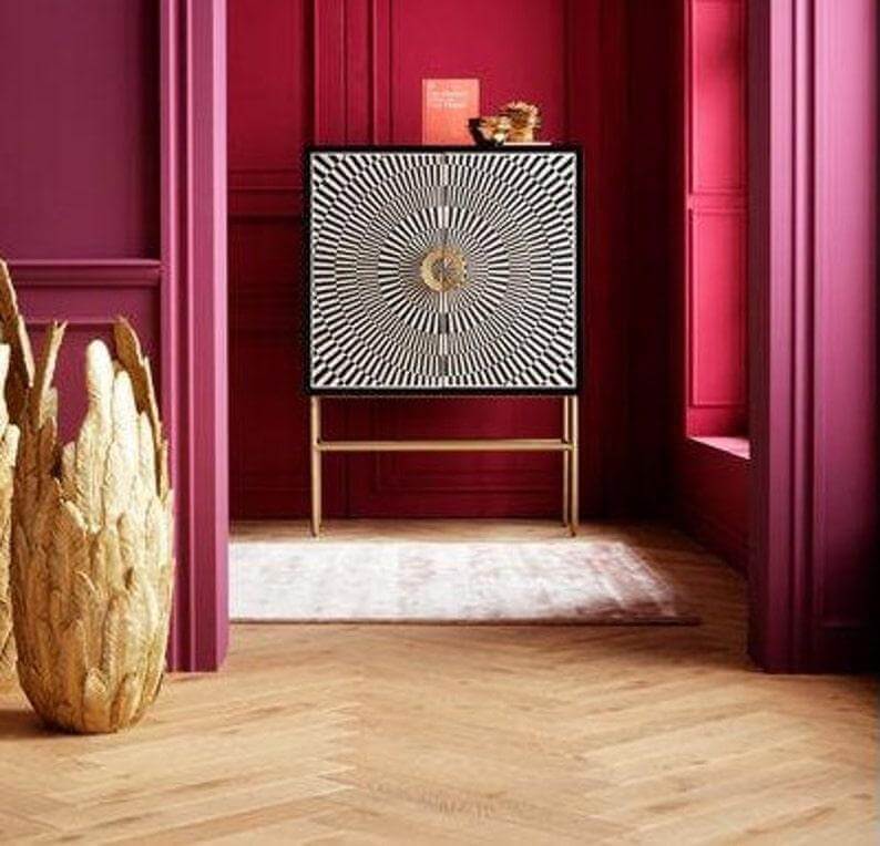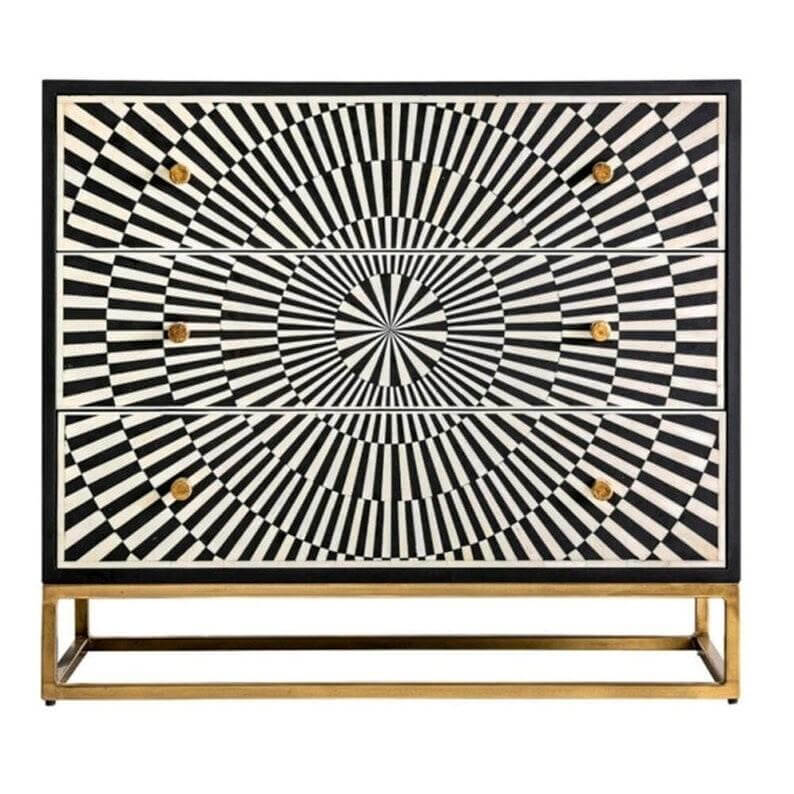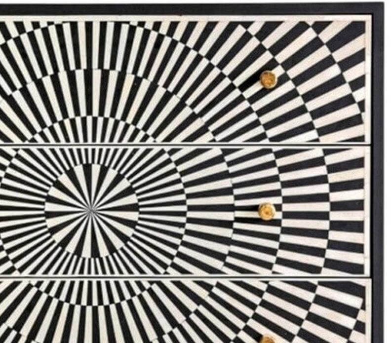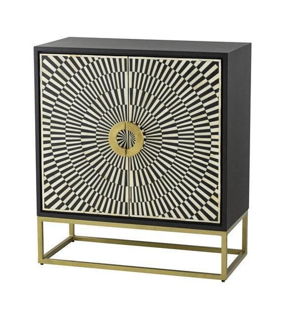 Otium Black White Bone Inlay Bar Cabinet. Modern elegance with an Art Deco design, Otium collection by Avant Garde Furniture represents a timeless style in a functional Bar Cabinet. This piece is sure to become the centrepiece of any room with its sunburst of black and white bone shards that adorn the front doors. A contemporary brass base and neutral hardware give the piece the feel of old Hollywood glamour.