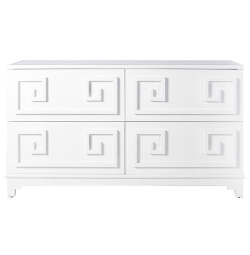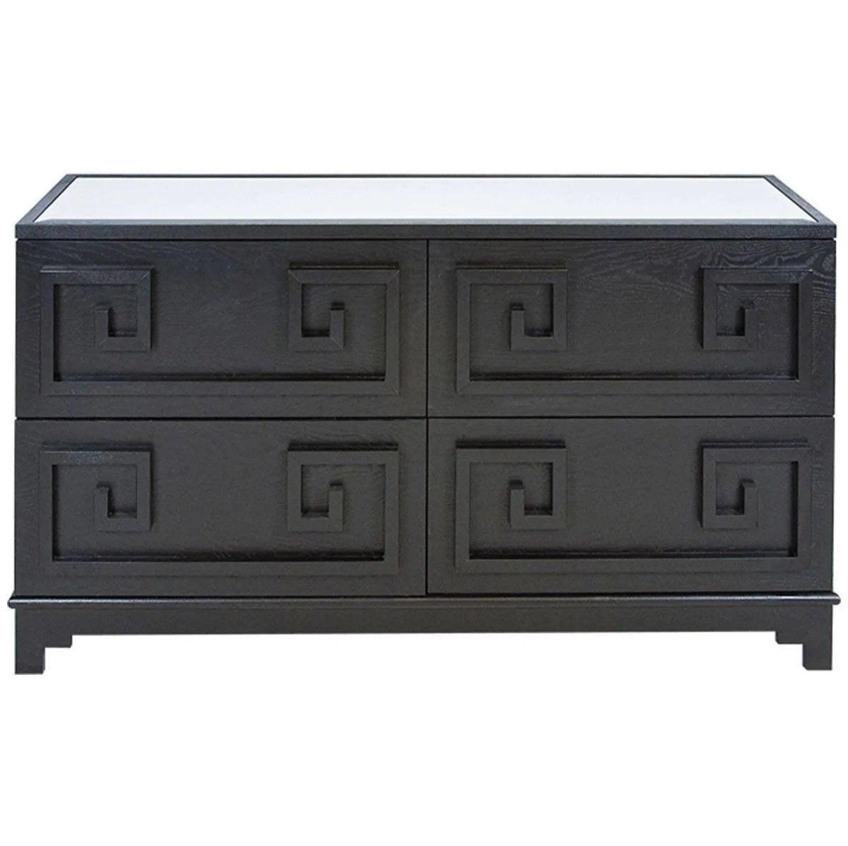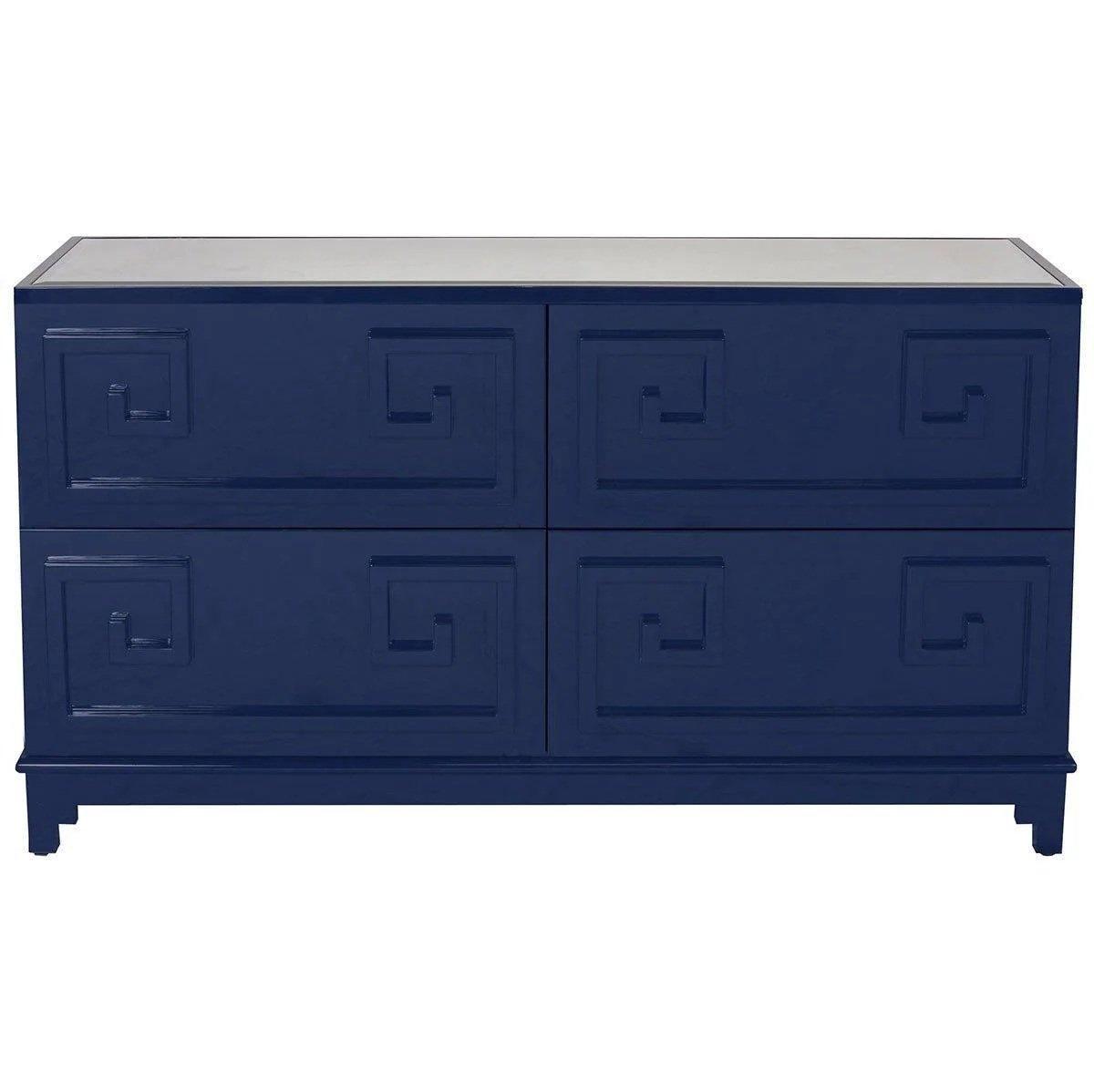Pagoda greek key four drawer chest in navy lacquer with bevelled mirror top. Matching designs in this collection.
