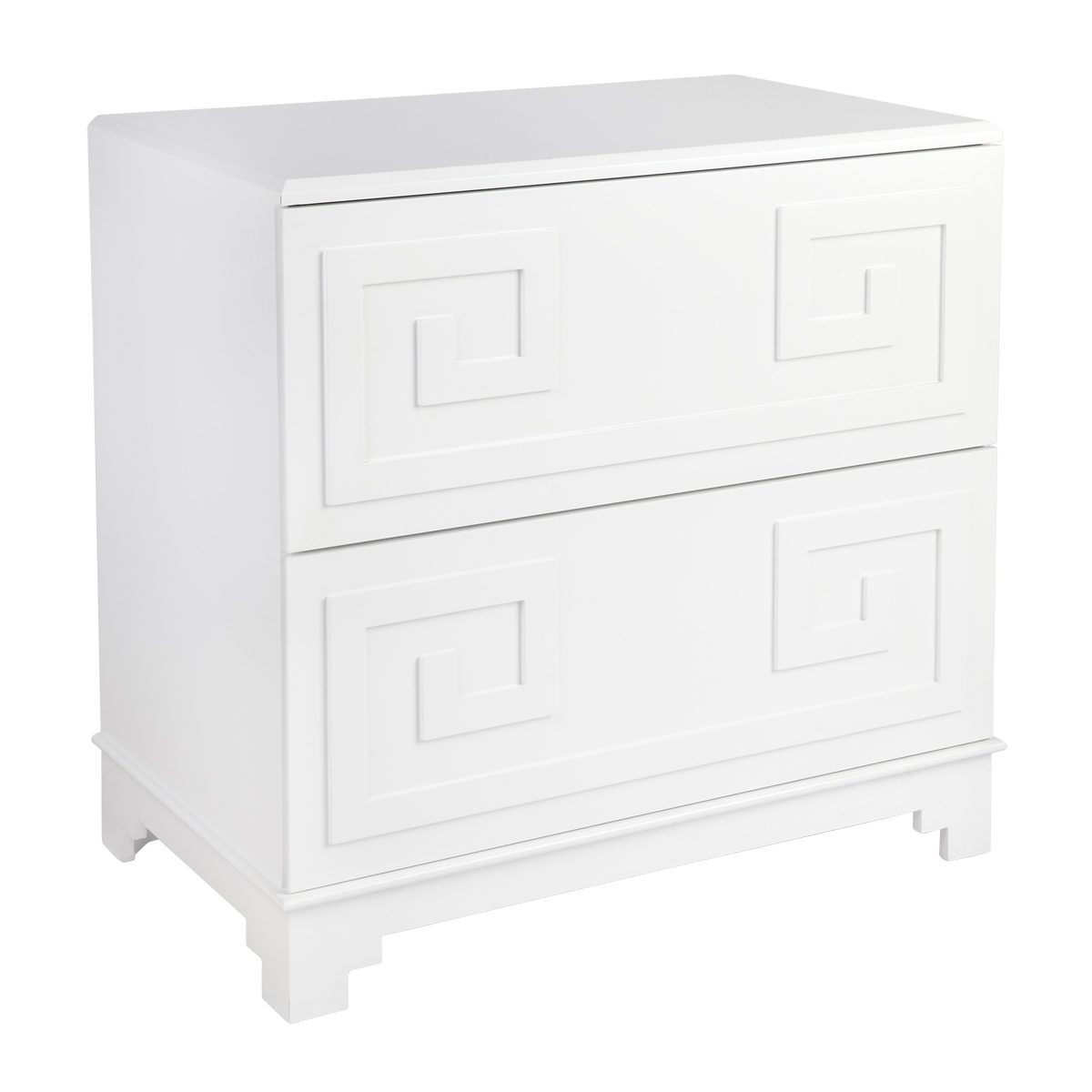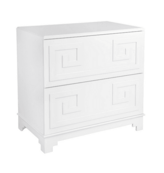 The Pagoda collection Greek key bedside table merges inspiration drawn from ancient Greek symbolism together with the bold use of colour and contrast typical to a Hollywood Regency design style to deliver a sense of grandeur and opulence. A continuous linear Greek Key symbol, representative of eternity and unity, adorns this two drawer bedside table with a fresh white lacquered finish. Generously proportioned, the Greek Key bedside table offers style and practical storage solutions for your bedroom space. White lacquered two drawer bedside table with a greek key molded design on the drawer fronts.