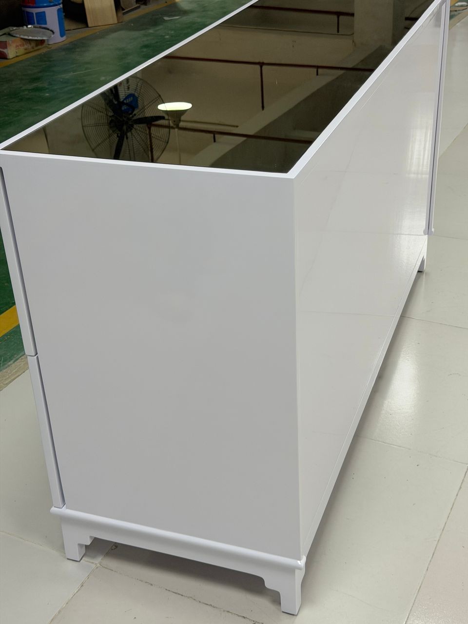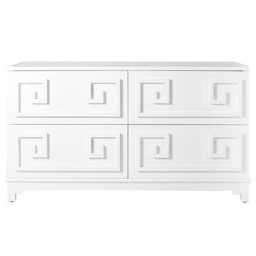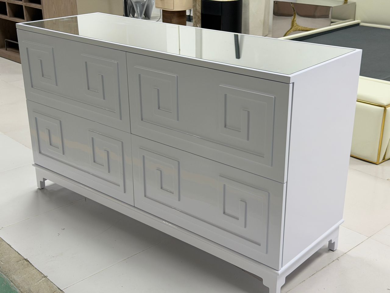 Pagoda greek key four drawer bedside table in white lacquer with inlay mirror top.