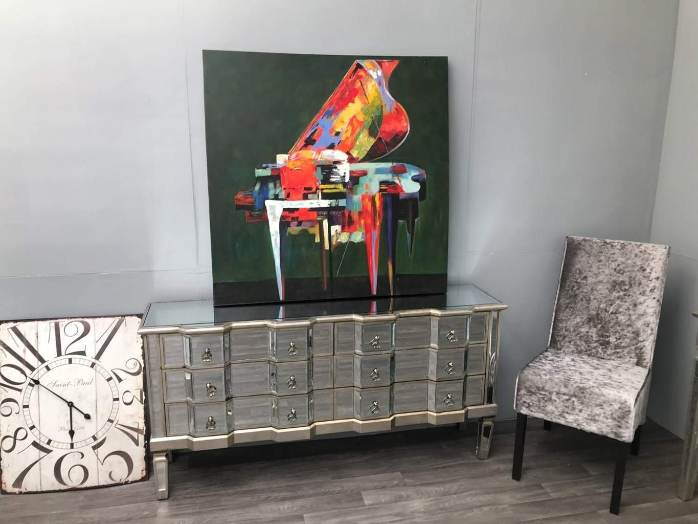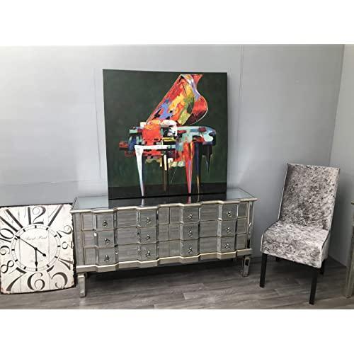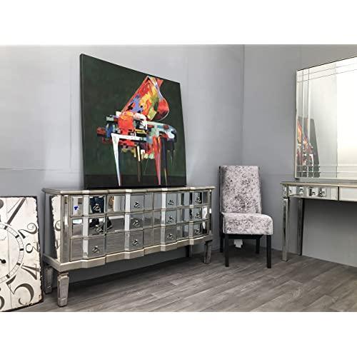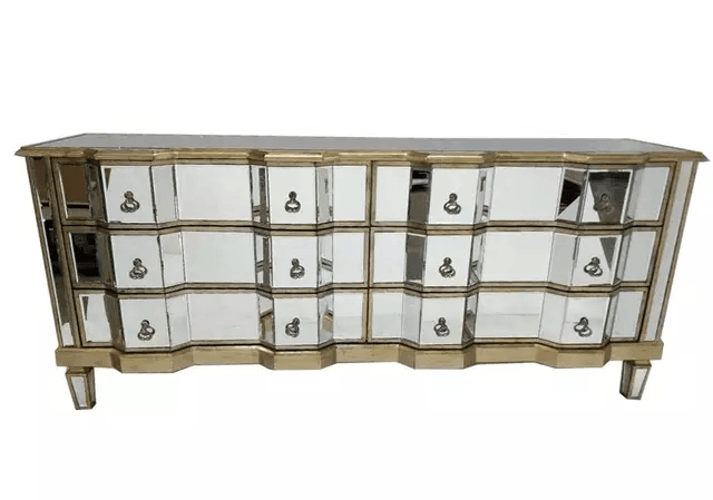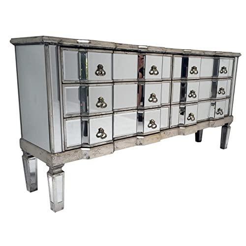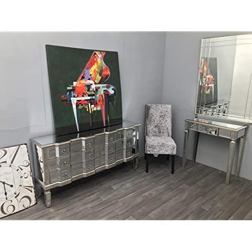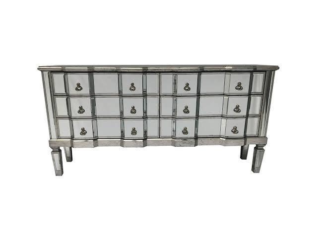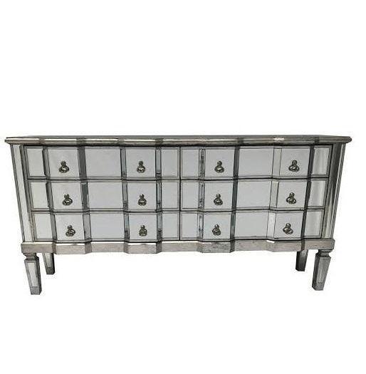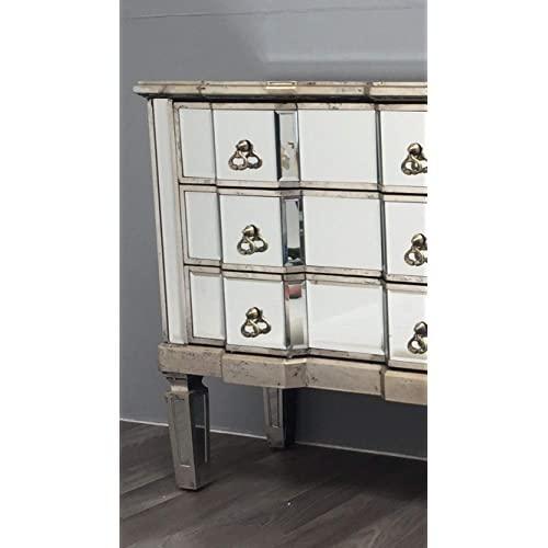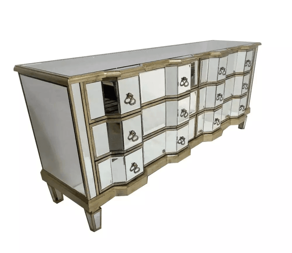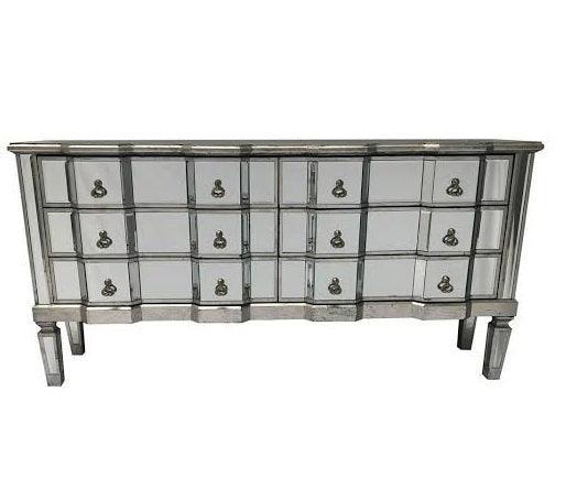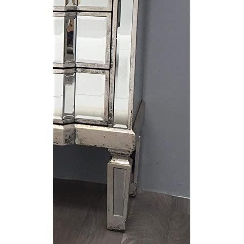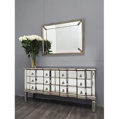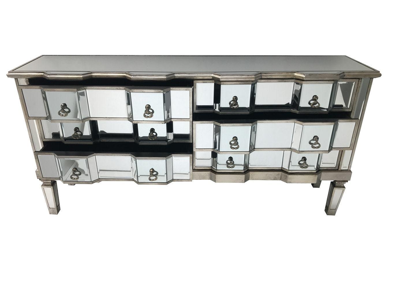Palazzo 6 Drawer Antique mirror set of drawers with Silver details with Antique Silver hardware. Available in Antique Gold or Silver. Palazzo 6 Drawer Antique mirror set of drawers with Gold details with Antique Silver hardware. Available in Antique Gold or Silver. A stunning, Large vintage mirrored chest of drawers, with bevelled mirror top, sides and legs and beautiful antiqued silver wood edging. The stylish mirrored chest of drawers is an elegant addition to any room.