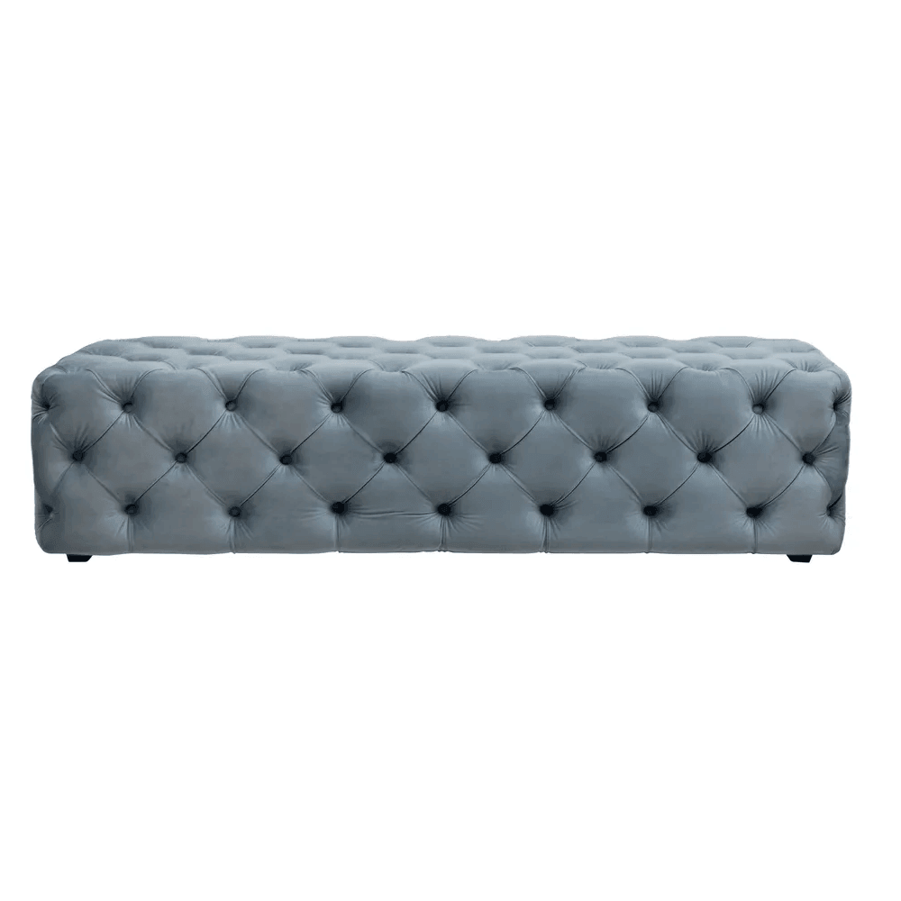 Dove Blue velvet upholstered bench ottoman with detailed tufted buttons