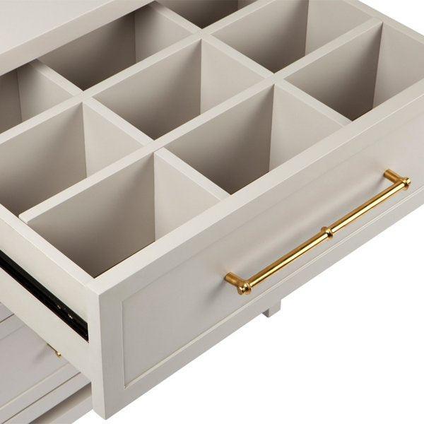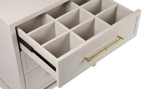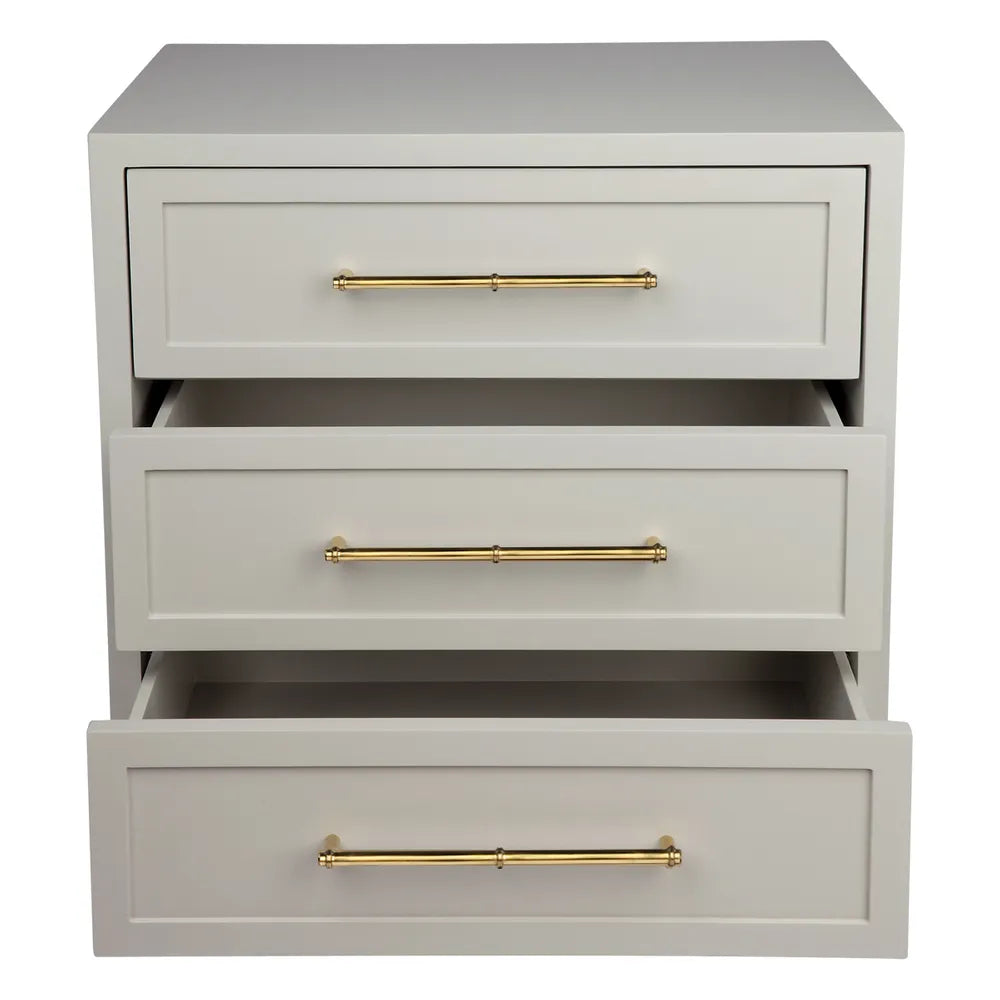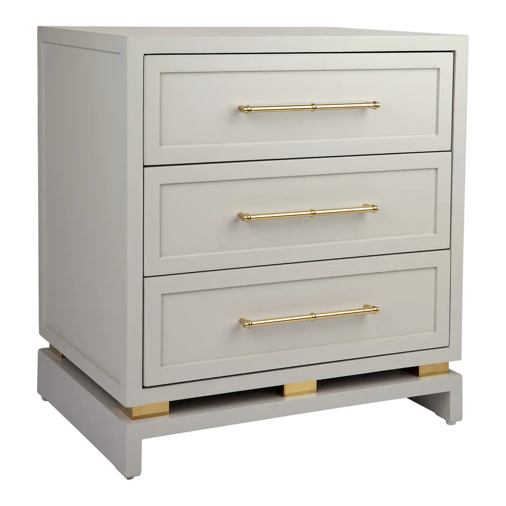 Soft grey satin finished three drawer bedside table with an accessories divider in top drawer and polished gold, bamboo style handles. Made of solid hardwood.