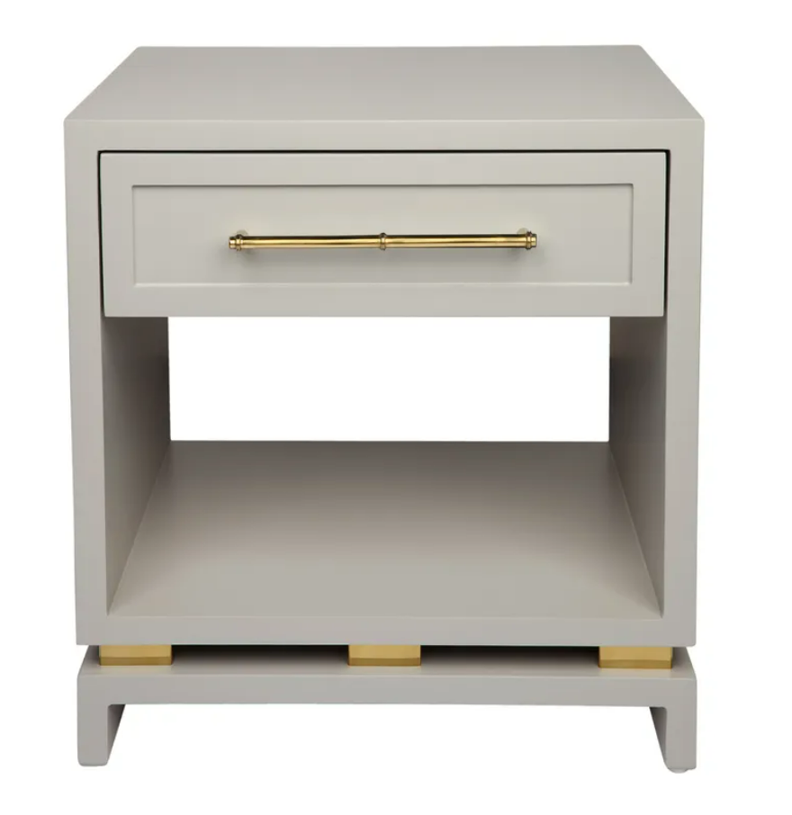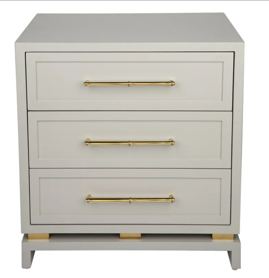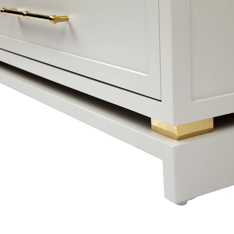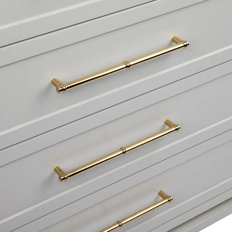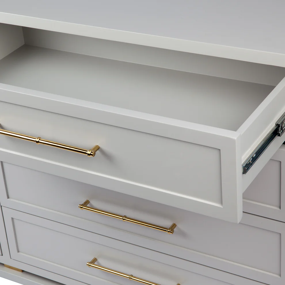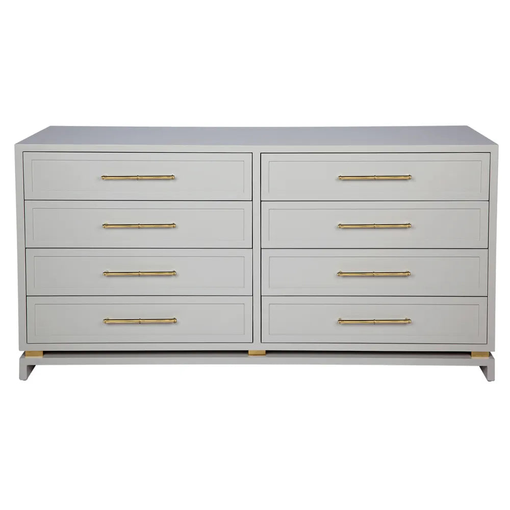 Timelessly elegant, this eight drawer chest has been completed in a soft grey satin finish complimented with eight stunning polished gold bamboo style handles. Made with Solid hardwood
