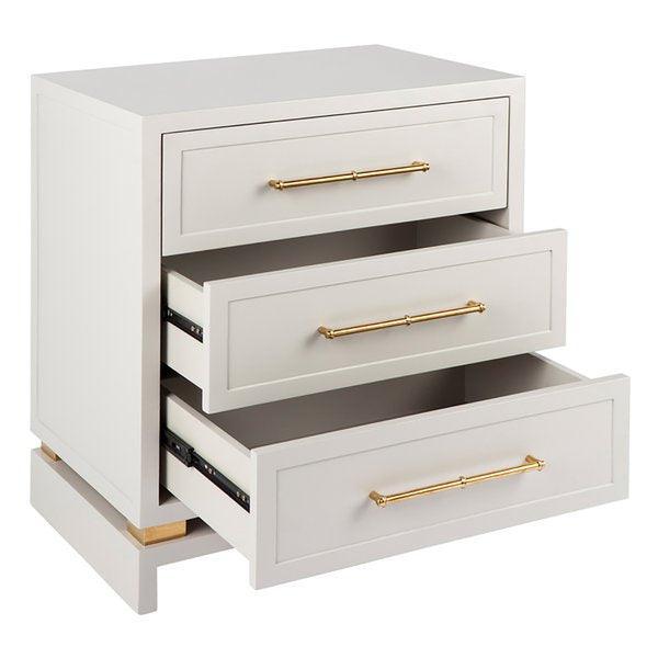 White satin finished three drawer bedside table with an accessories divider in top drawer and polished gold, bamboo style handles. Made of solid hardwood.
