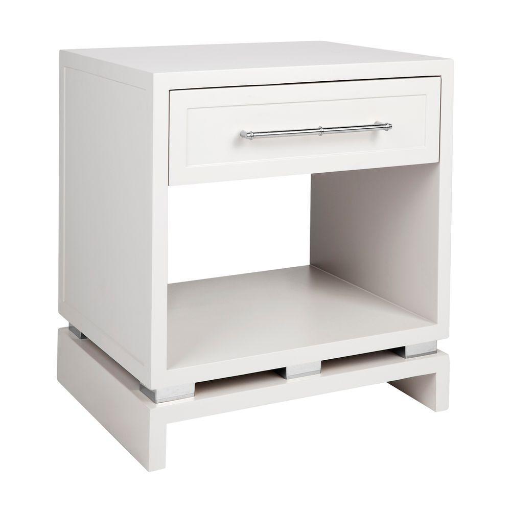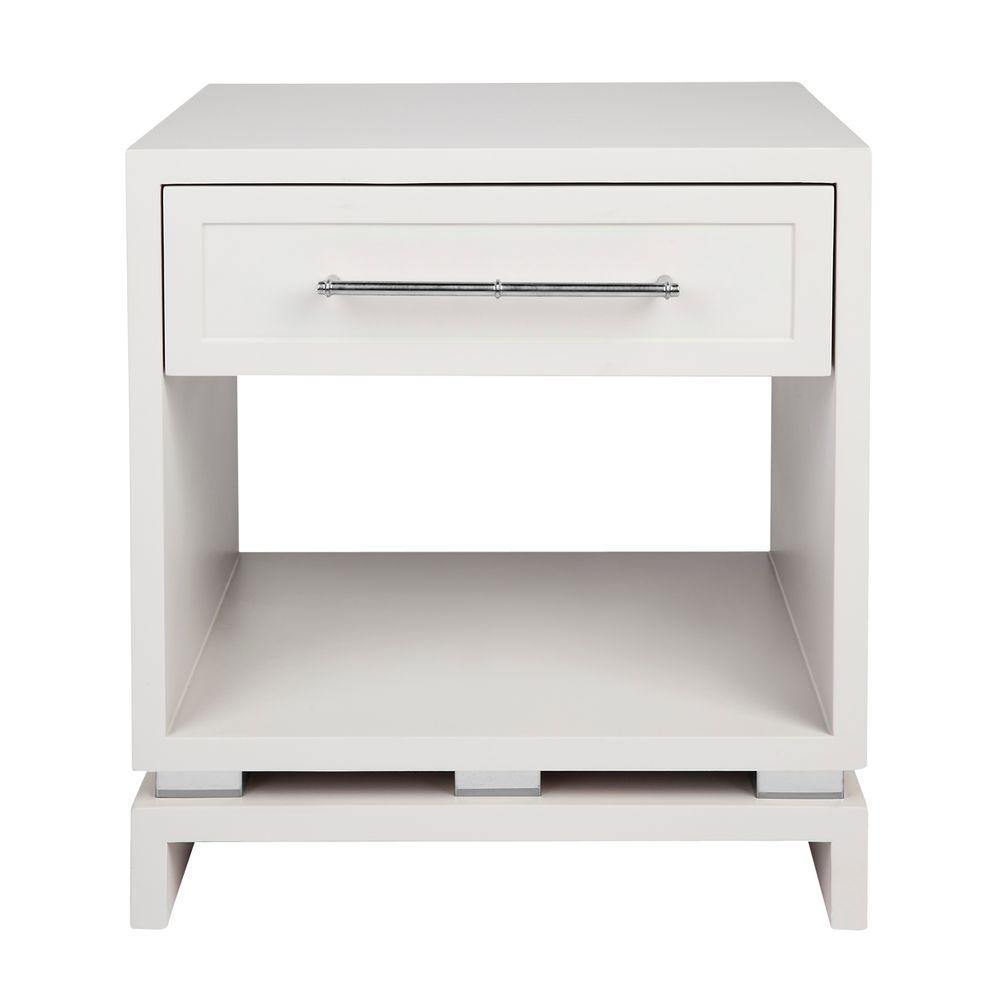 Smaller in scale without compromising function, the timelessly elegant Pearl bedside table small is a refined version of its bigger sister. With a wide table top, roomy nook and top drawer making this a smart storage option for smaller sophisticated spaces. A crisp white satin finish is complimented with stunning polished nickel bamboo style handles. Made with solid hardwood.