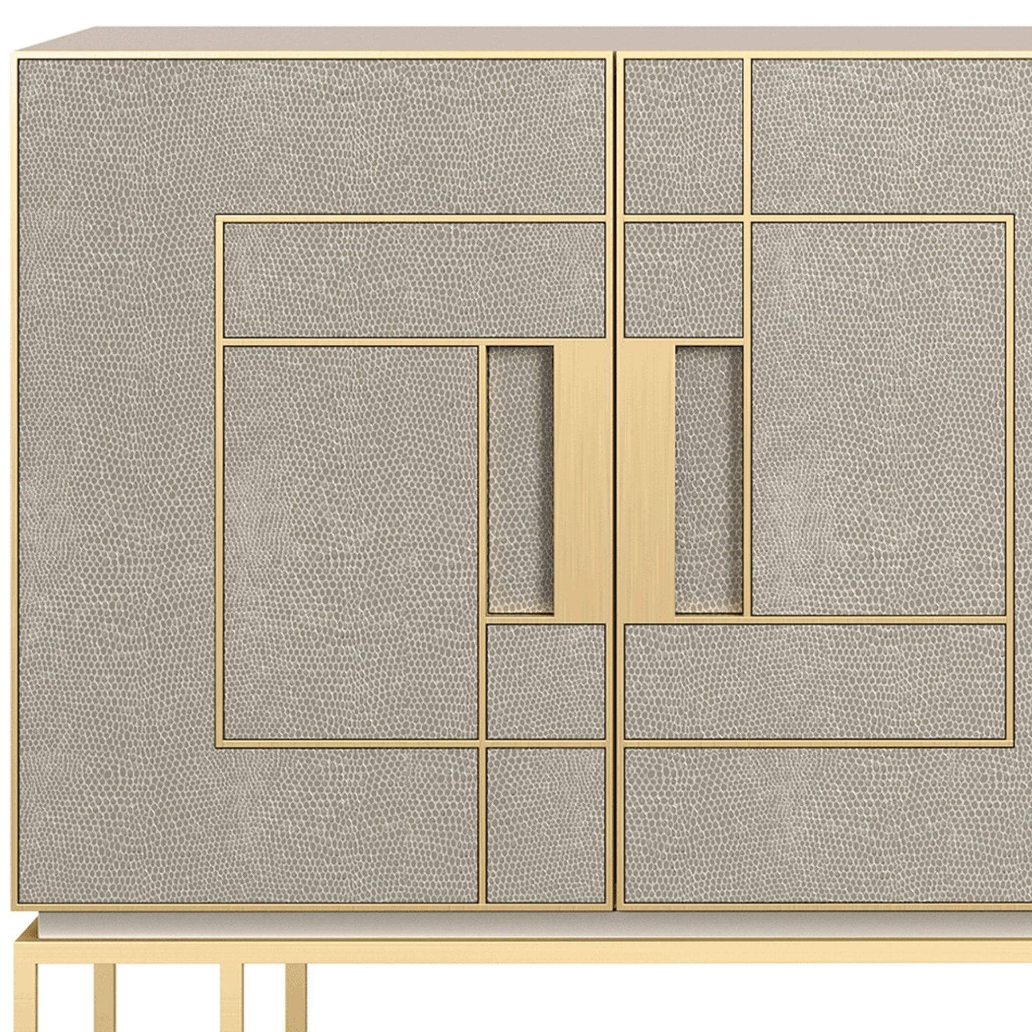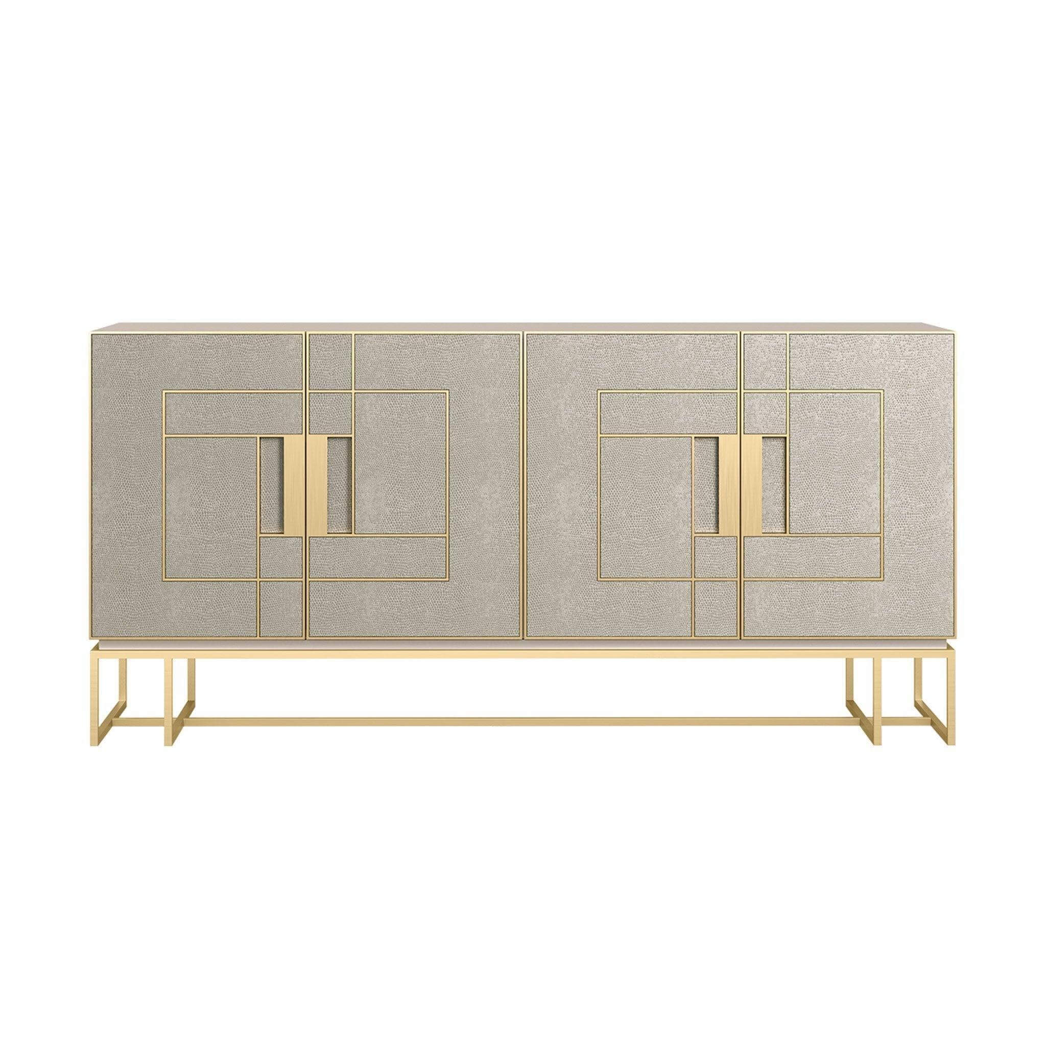 The Piemont Leather and brushed brass leather sideboard is an impressive storage piece. The front of all four doors is inlaid with Cream embossed python genuine leather and set with brushed brass details.