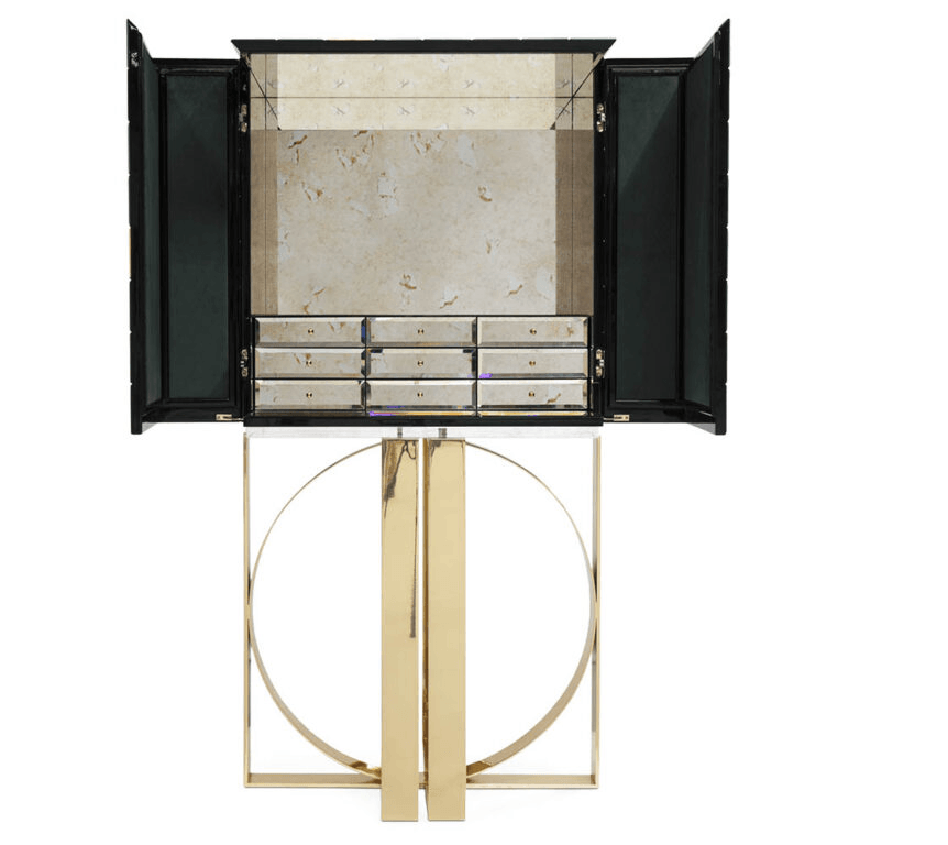 Interior: Two doors finished on the inside in a diamond quilted blue silk fabric open to nine drawers with gold knobs and a cabinet space all finished in aged mirror. Base: Polished brass